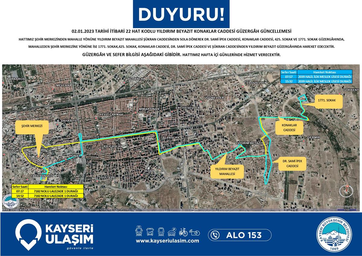 1 - 02.01.2023 TARİHİ İTİBARİ 22 HAT KODLU YILDIRIM BEYAZIT KONAKLAR CADDESİ GÜZERGÂH GÜNCELLEMESİ HATTIMIZ ŞEHİR MERKEZİNDEN MAHALLE YÖNÜNE YILDIRIM BEYAZIT MAHALLESİ ŞÜKRAN CADDESİNDEN SOLA DÖNEREK DR. SAMİ İPEK CADDESİ, KONAKLAR CADDESİ, 425. SOKAK VE 1771. SOKAK GÜZERGÂHINDA, MAHALLEDEN ŞEHİR MERKEZİNE YÖNÜNE İSE 1771. SOKAK,425. SOKAK, KONAKLAR CADDESİ, DR. SAMİ İPEK CADDESİ VE ŞÜKRAN CADDESİNDEN YILDIRIM BEYAZIT GÜZERGÂHINDA HAREKET EDECEKTİR