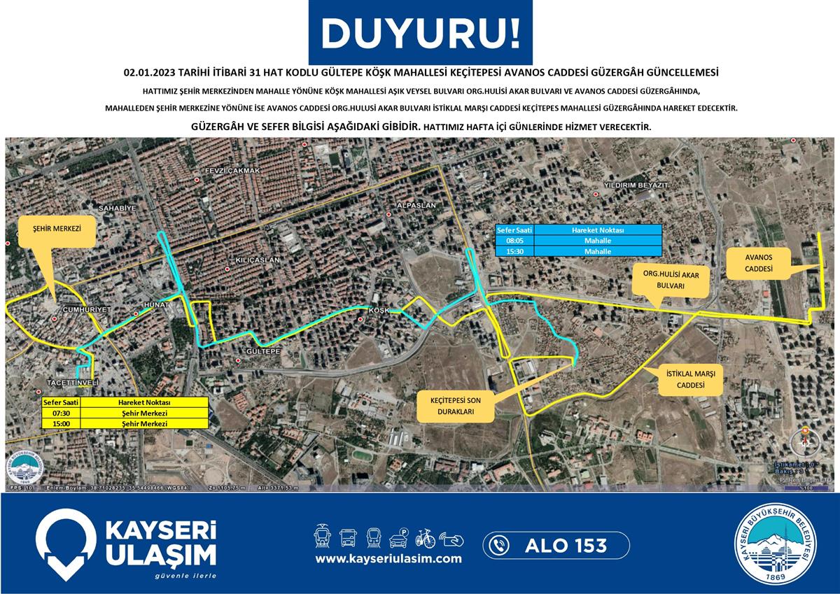 2 - 02.01.2023 TARİHİ İTİBARİ 31 HAT KODLU GÜLTEPE KÖŞK MAHALLESİ KEÇİTEPESİ AVANOS CADDESİ GÜZERGÂH GÜNCELLEMESİ HATTIMIZ ŞEHİR MERKEZİNDEN MAHALLE YÖNÜNE KÖŞK MAHALLESİ AŞIK VEYSEL BULVARI ORG.HULİSİ AKAR BULVARI VE AVANOS CADDESİ GÜZERGÂHINDA, MAHALLEDEN ŞEHİR MERKEZİNE YÖNÜNE İSE AVANOS CADDESİ ORG.HULUSİ AKAR BULVARI İSTİKLAL MARŞI CADDESİ KEÇİTEPES MAHALLESİ GÜZERGÂHINDA HAREKET EDECEKTİR.