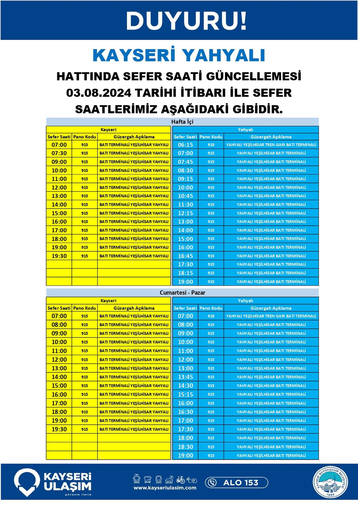 03-05 Ağustos 2024 Tarihinden itibaren Bazı Sefer Saat ve Güzergah Güncellemeleri Yapılmıştır.