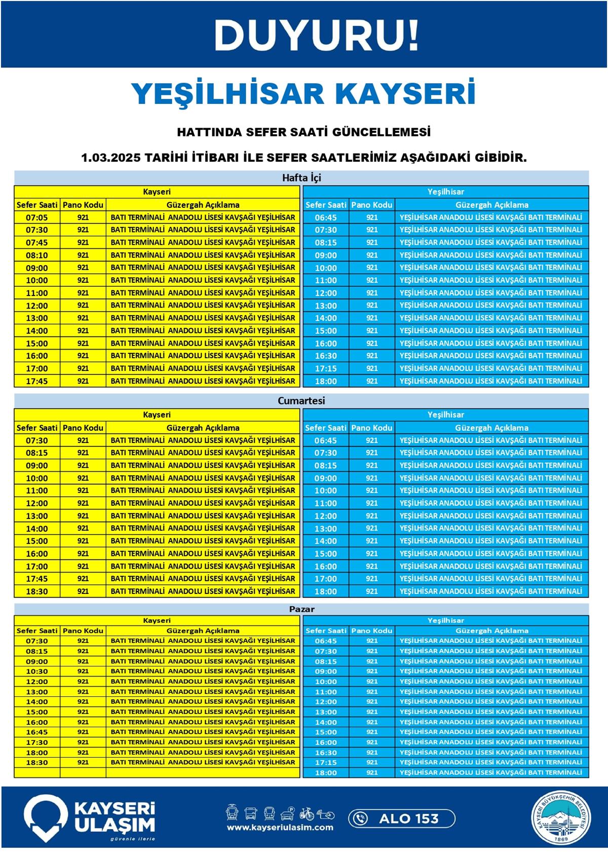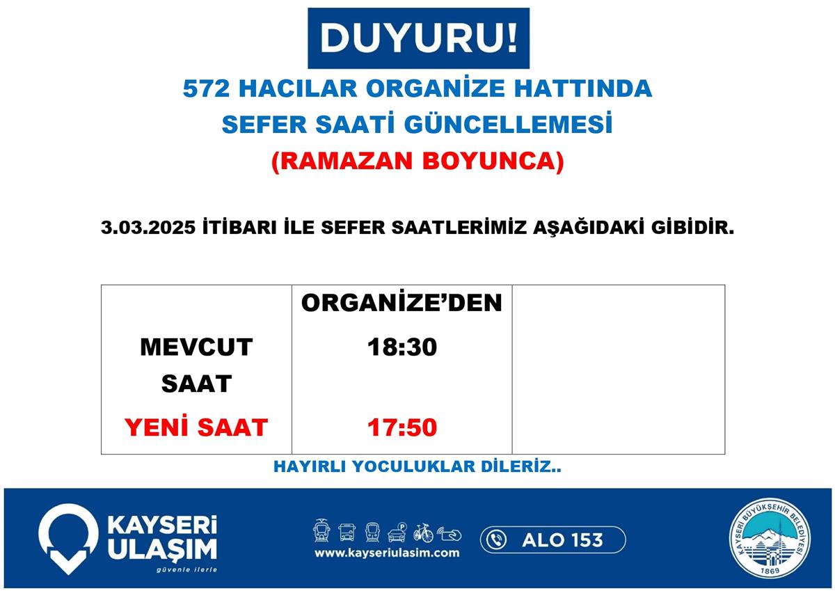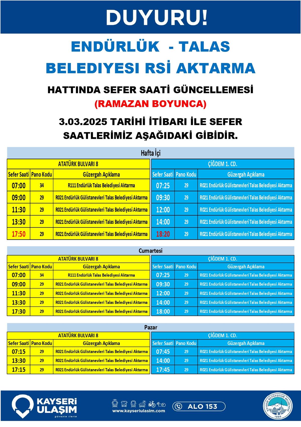 ENDÜRLÜK - TALAS BELEDIYESI RSİ AKTARMA HATTINDA SEFER SAATİ GÜNCELLEMESİ
