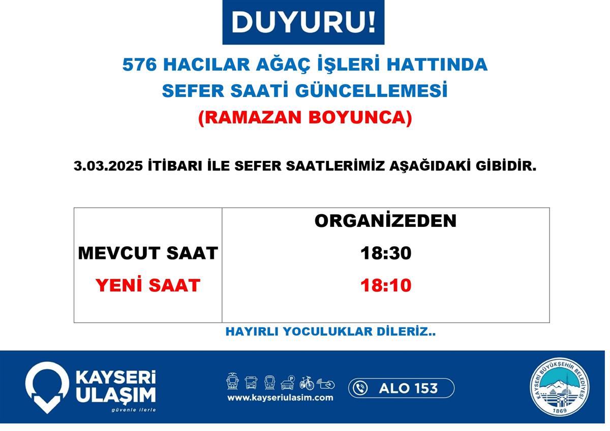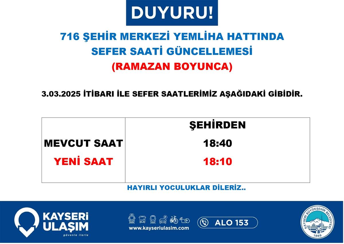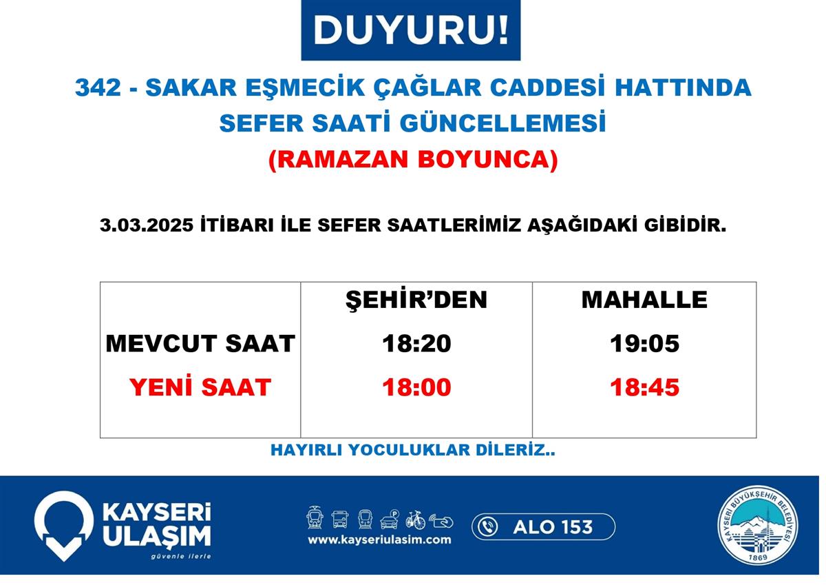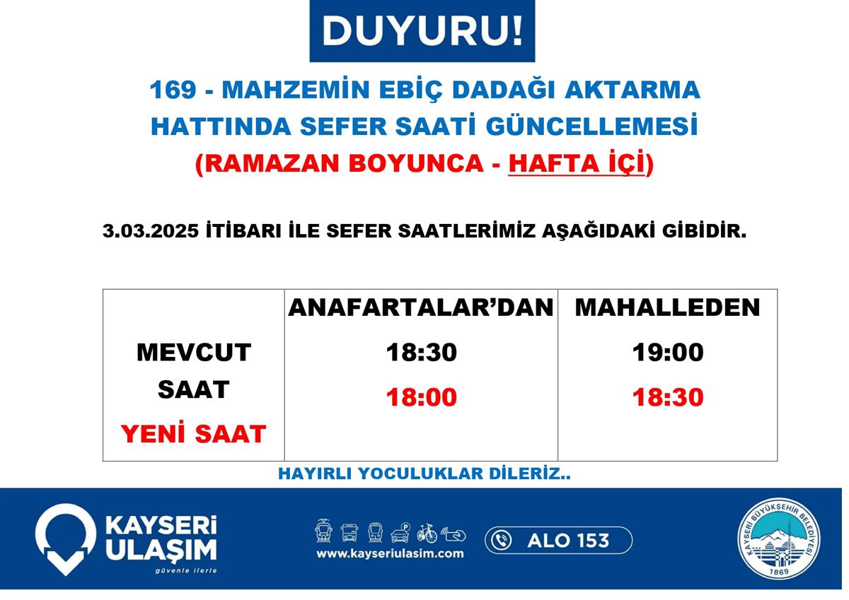 ENDÜRLÜK - TALAS BELEDIYESI RSİ AKTARMA HATTINDA SEFER SAATİ GÜNCELLEMESİ