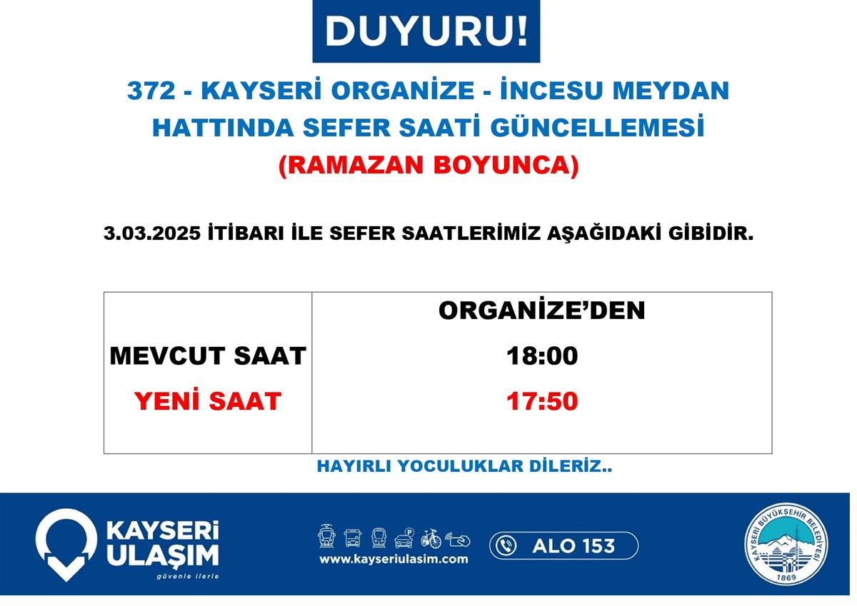 KAYSERİ ORGANİZE - İNCESU MEYDAN HATTINDA SEFER SAATİ GÜNCELLEMESİ