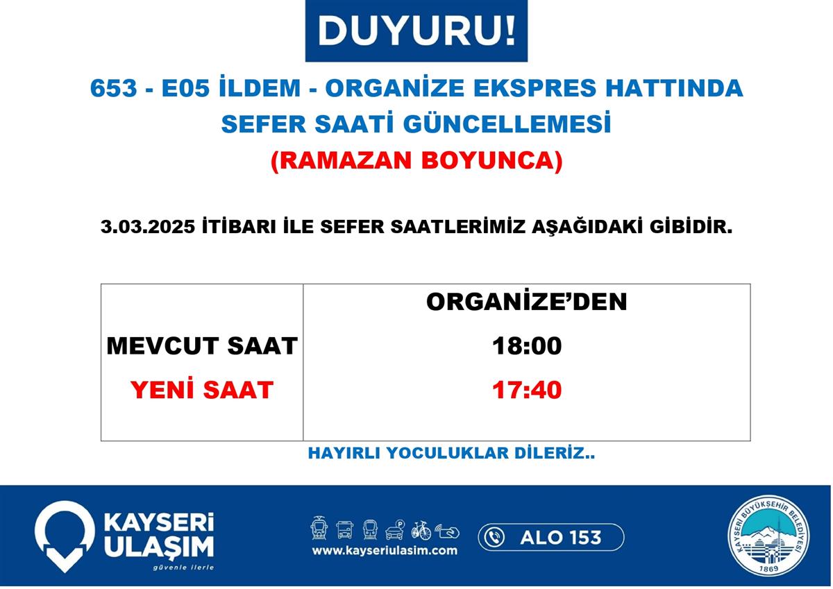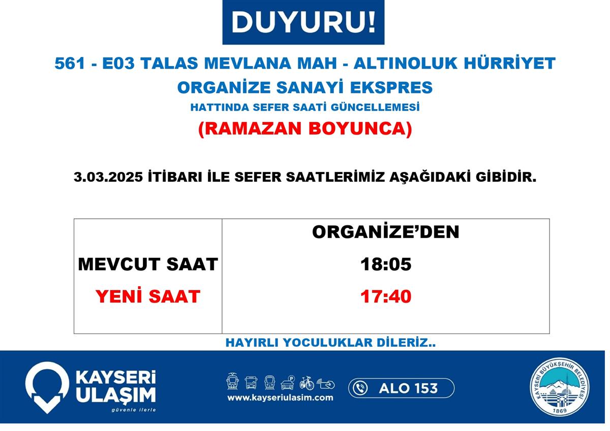 TALAS MEVLANA MAH - ALTINOLUK HÜRRİYET ORGANİZE SANAYİ EKSPRES HATTINDA SEFER SAATİ GÜNCELLEMESİ