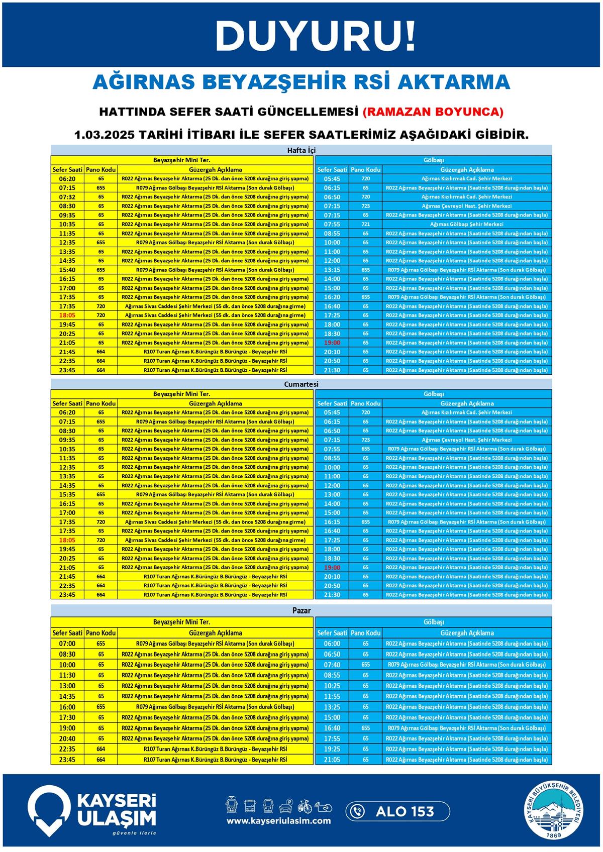 AĞIRNAS BEYAZŞEHİR RSİ AKTARMA HATTINDA SEFER SAATİ GÜNCELLEMESİ