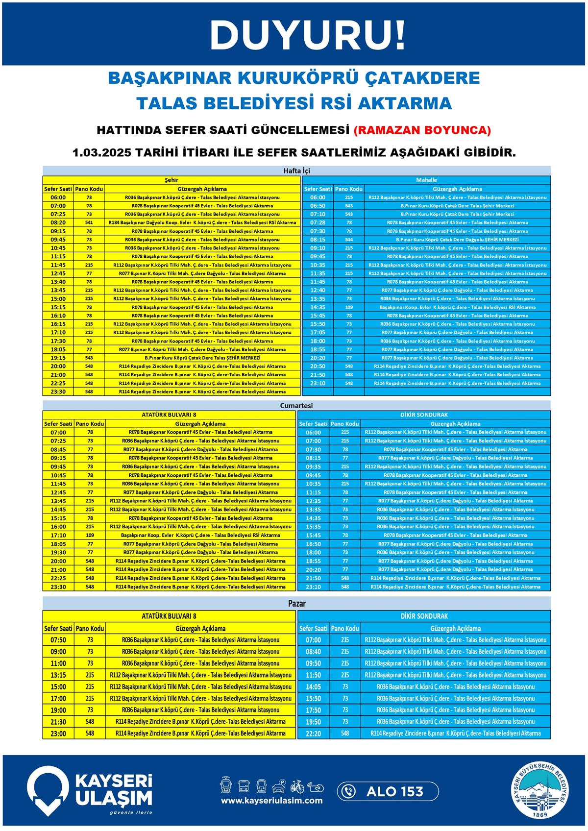 BAŞAKPINAR KURUKÖPRÜ ÇATAKDERE TALAS BELEDİYESİ RSİ AKTARMA HATTINDA SEFER SAATİ GÜNCELLEMESİ