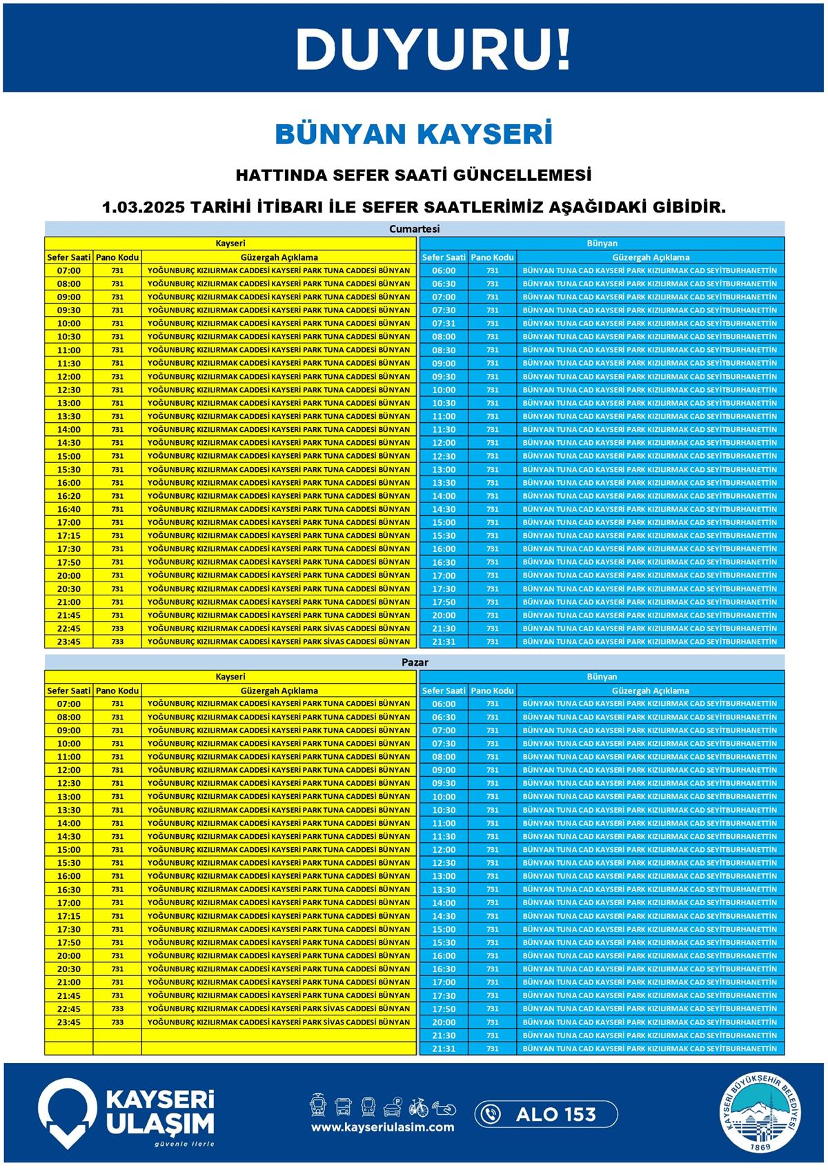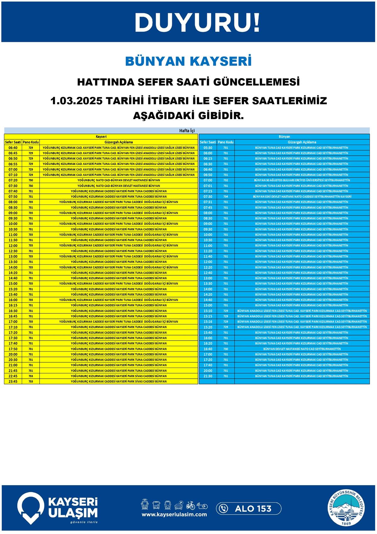 BÜNYAN KAYSERİ HATTINDA SEFER SAATİ GÜNCELLEMESİ