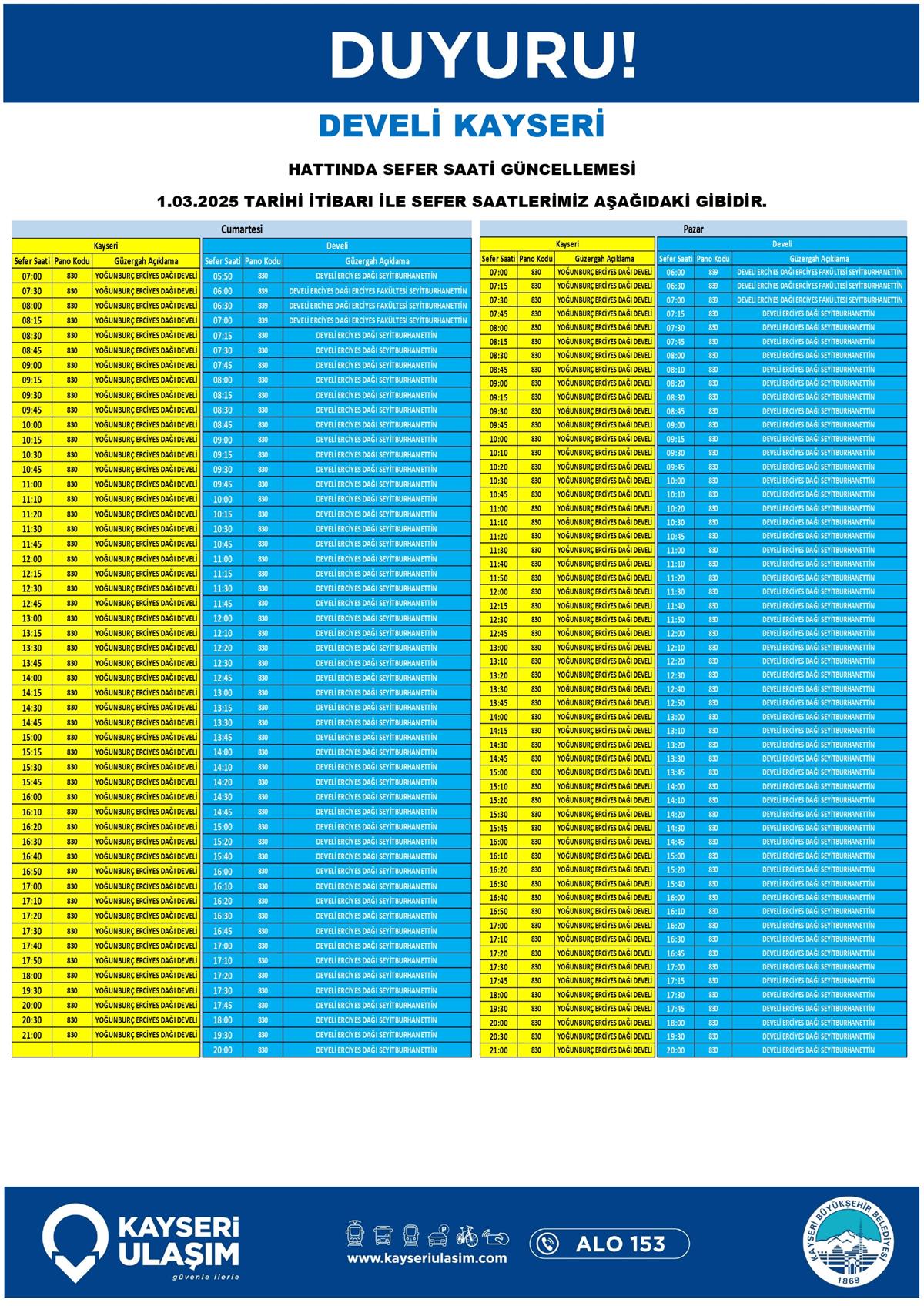 DEVELİ KAYSERİ HATTINDA SEFER SAATİ GÜNCELLEMESİ