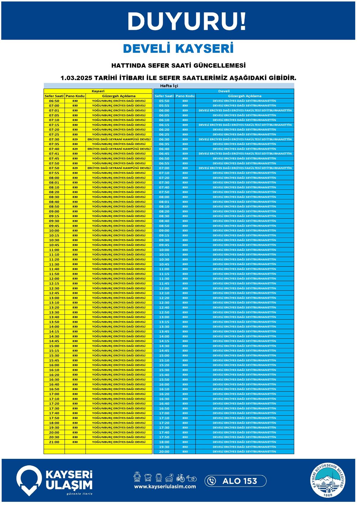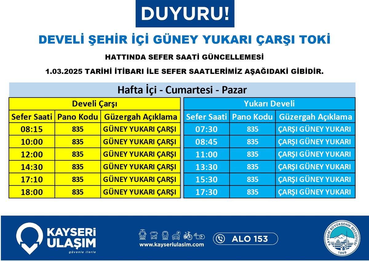 DEVELİ ŞEHİR İÇİ GÜNEY YUKARI ÇARŞI TOKİ HATTINDA SEFER SAATİ GÜNCELLEMESİ