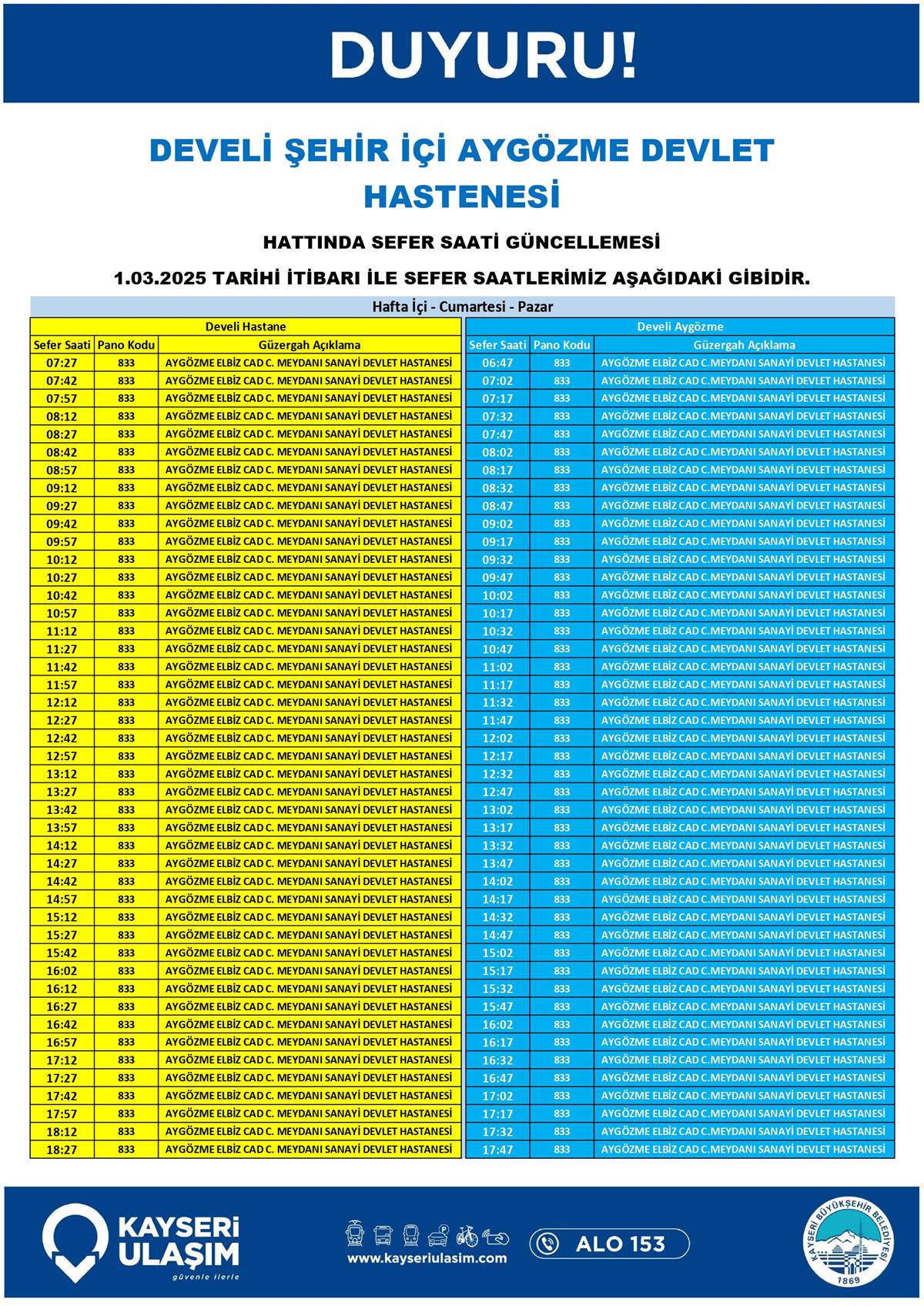 DEVELİ ŞEHİR İÇİ AYGÖZME DEVLET HASTENESİ HATTINDA SEFER SAATİ GÜNCELLEMESİ