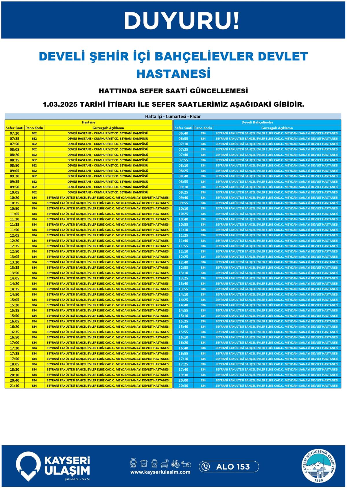 DEVELİ ŞEHİR İÇİ BAHÇELİEVLER DEVLET HASTANESİ HATTINDA SEFER SAATİ GÜNCELLEMESİ