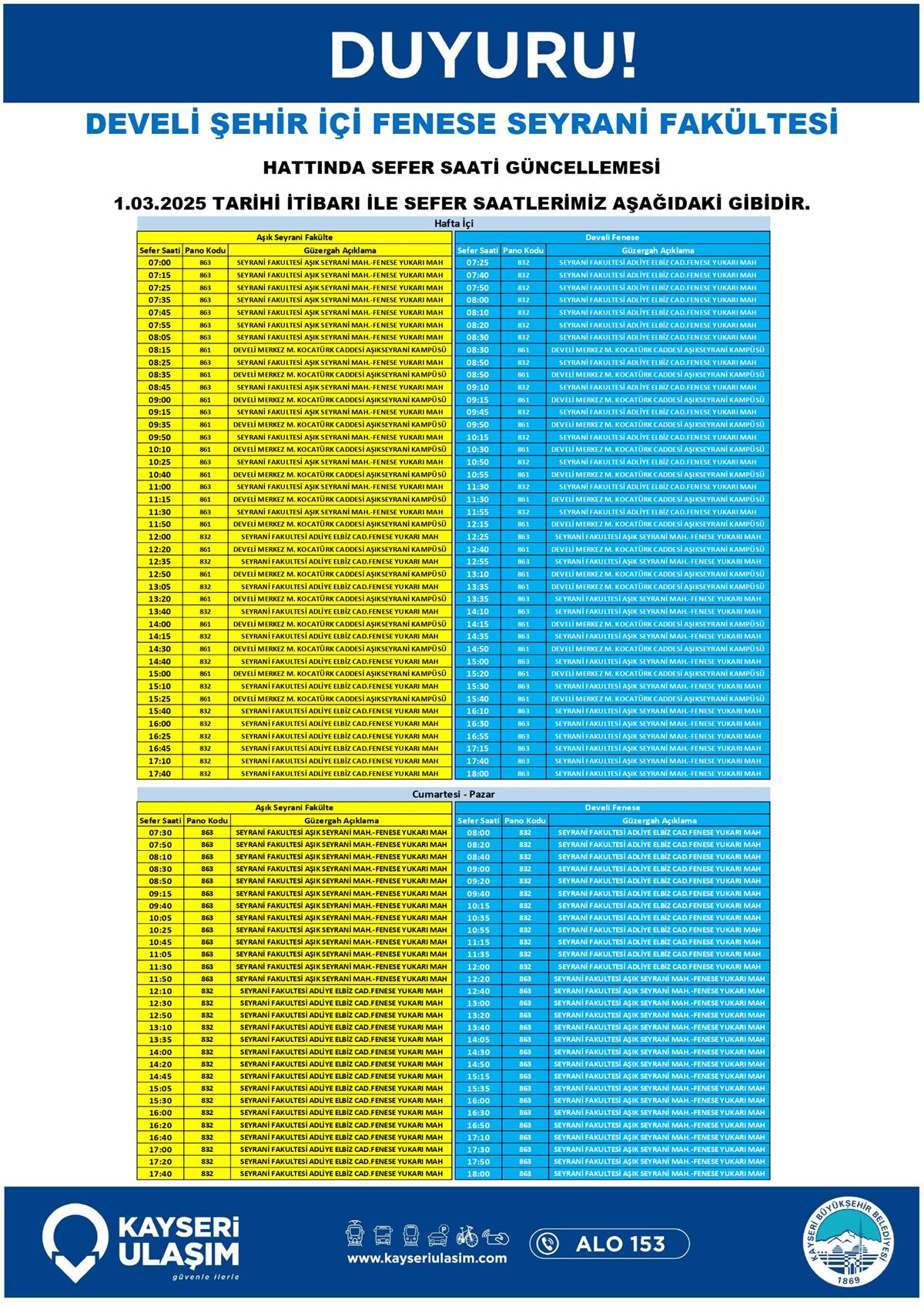 DEVELİ ŞEHİR İÇİ FENESE SEYRANİ FAKÜLTESİ HATTINDA SEFER SAATİ GÜNCELLEMESİ