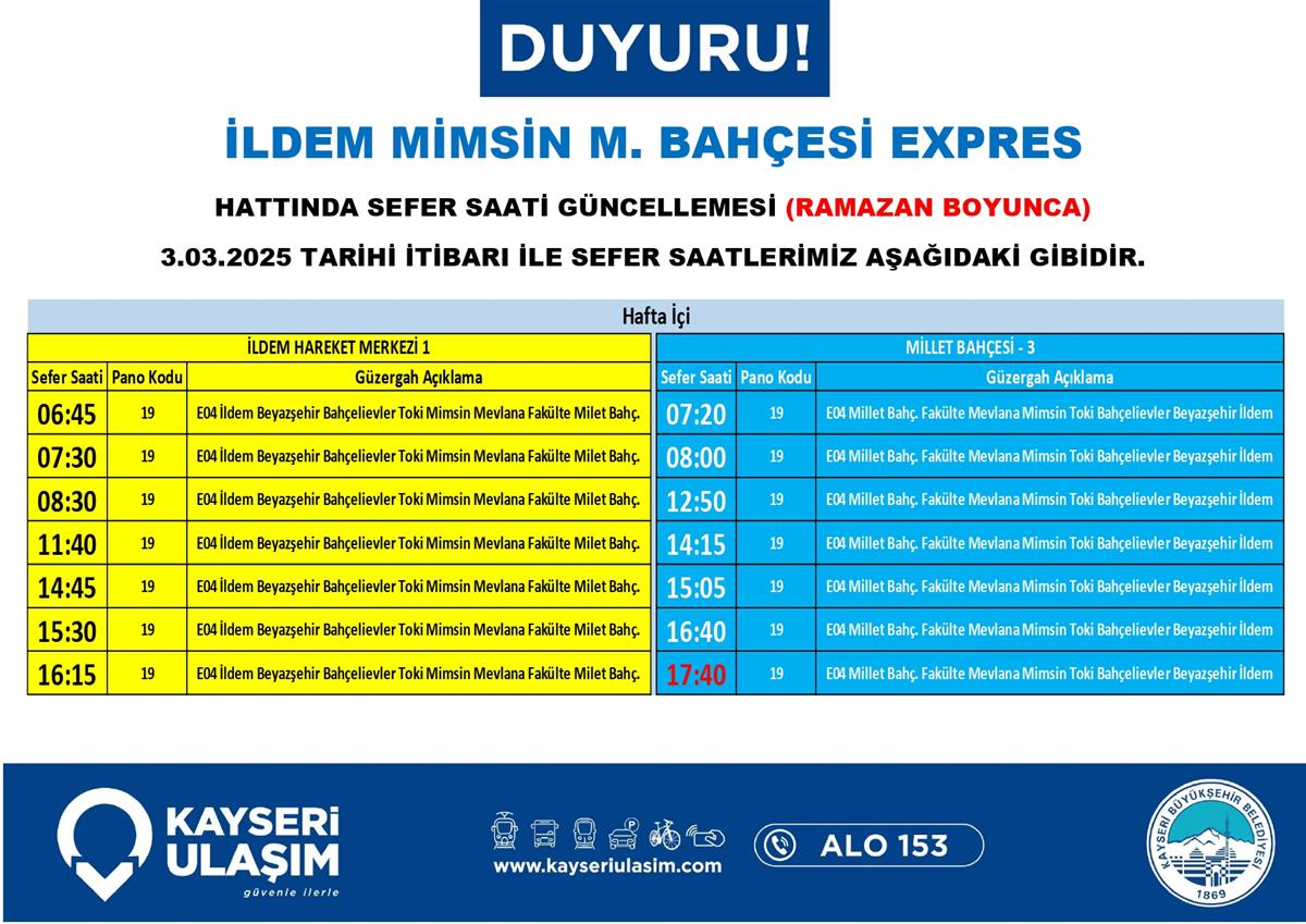 İLDEM MİMSİN M. BAHÇESİ EXPRES HATTINDA SEFER SAATİ GÜNCELLEMESİ