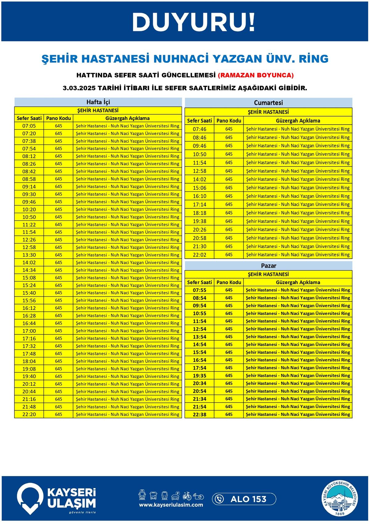 ŞEHİR HASTANESİ NUHNACİ YAZGAN ÜNV. RİNG HATTINDA SEFER SAATİ GÜNCELLEMESİ