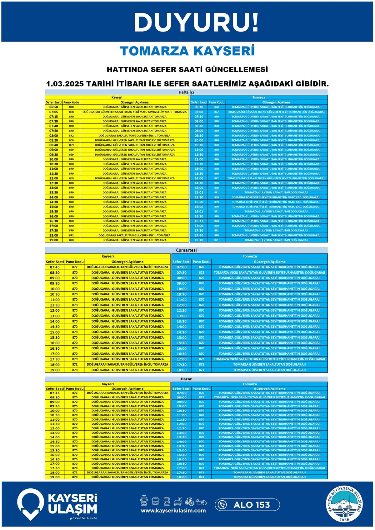 TOMARZA KAYSERİ HATTINDA SEFER SAATİ GÜNCELLEMESİ
