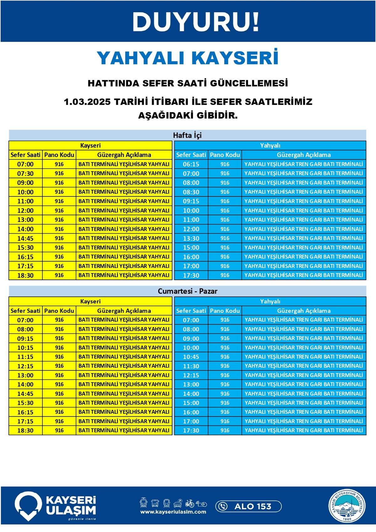 YAHYALI KAYSERİ HATTINDA SEFER SAATİ GÜNCELLEMESİ