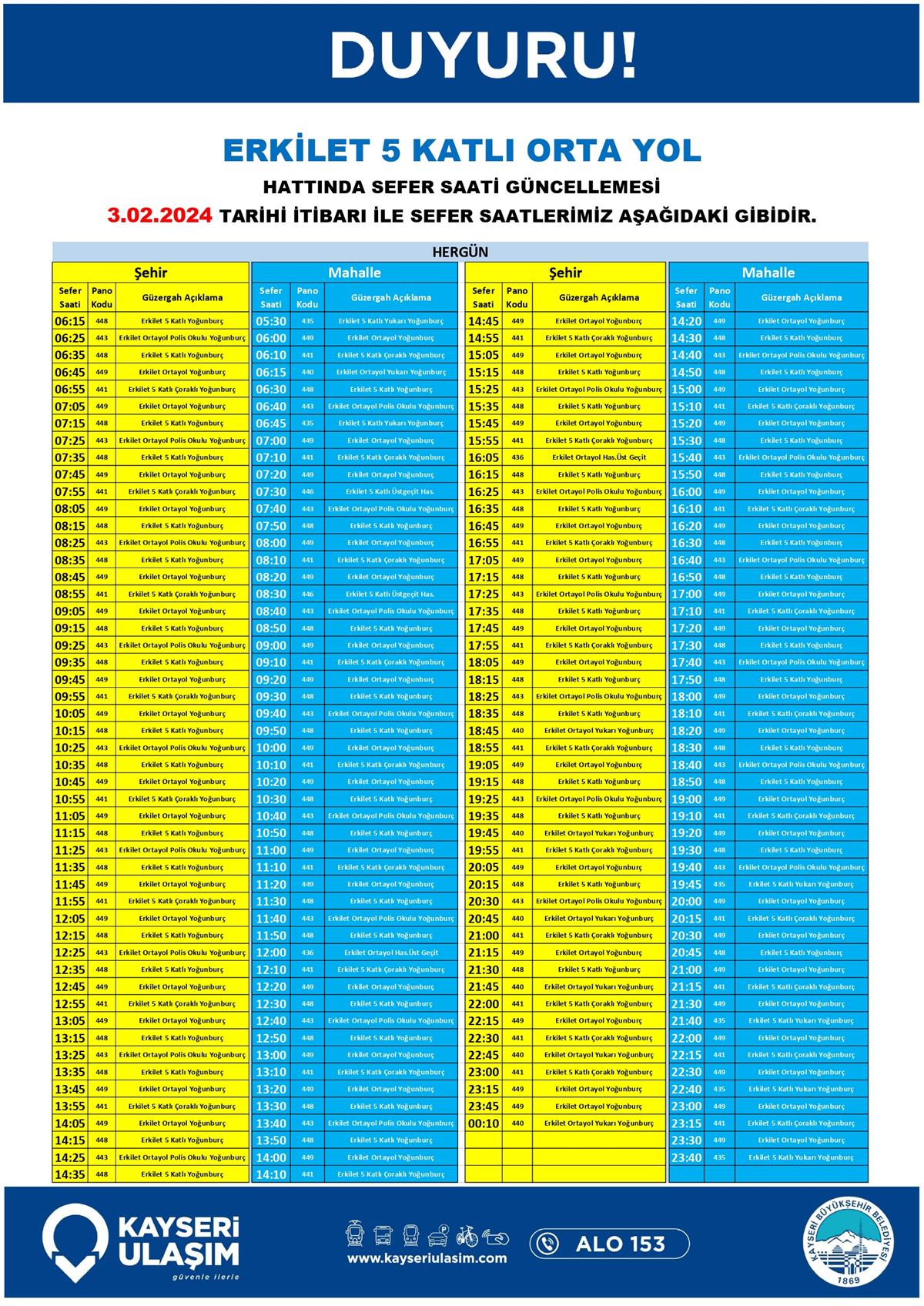 ERKİLET 5 KATLI ORTA YOL HATTINDA SEFER SAATİ GÜNCELLEMESİ