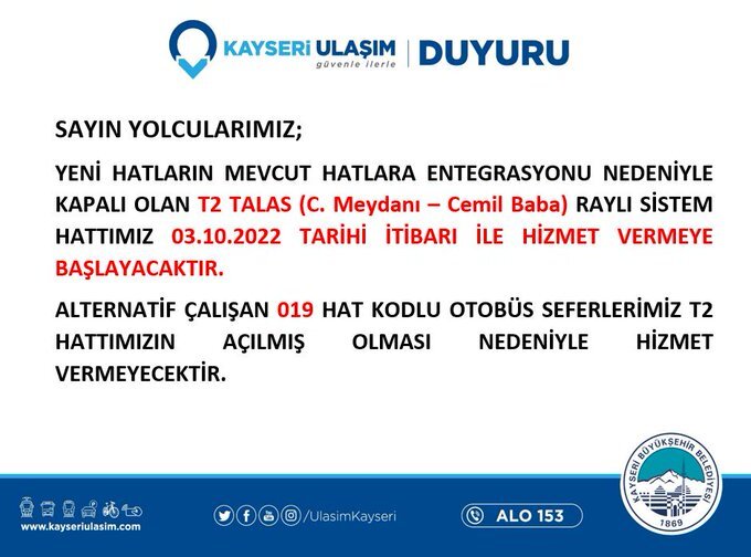 Sayın yolcularımız, Yeni hatların mevcut hatlara entegrasyonu nedeniyle kapalı olan T2 TALAS (C. Meydanı – Cemil Baba) raylı sistem hattımız 03.10.2022 tarihi itibarı ile hizmet vermeye başlayacaktır. İyi yolculuklar dileriz.