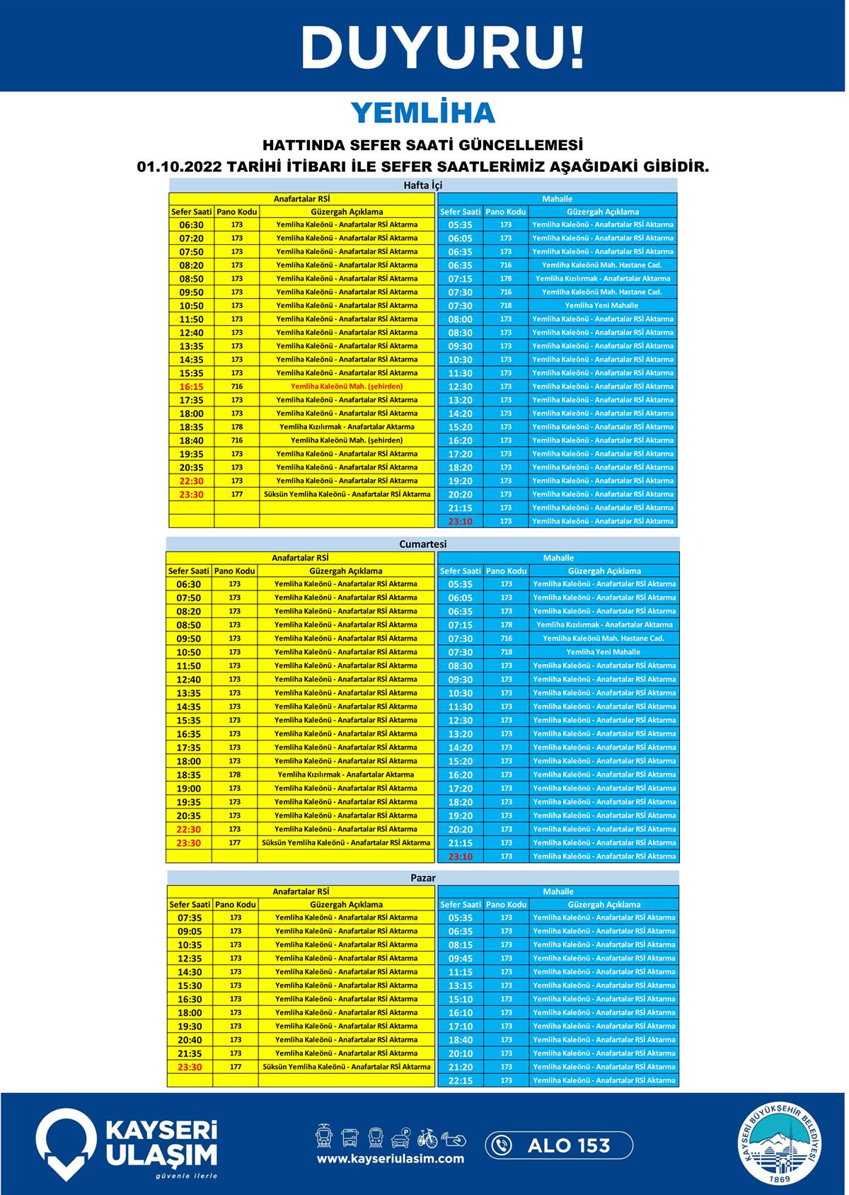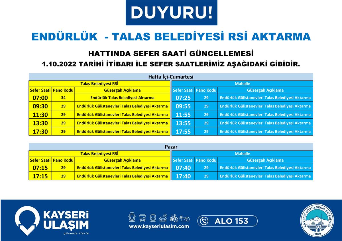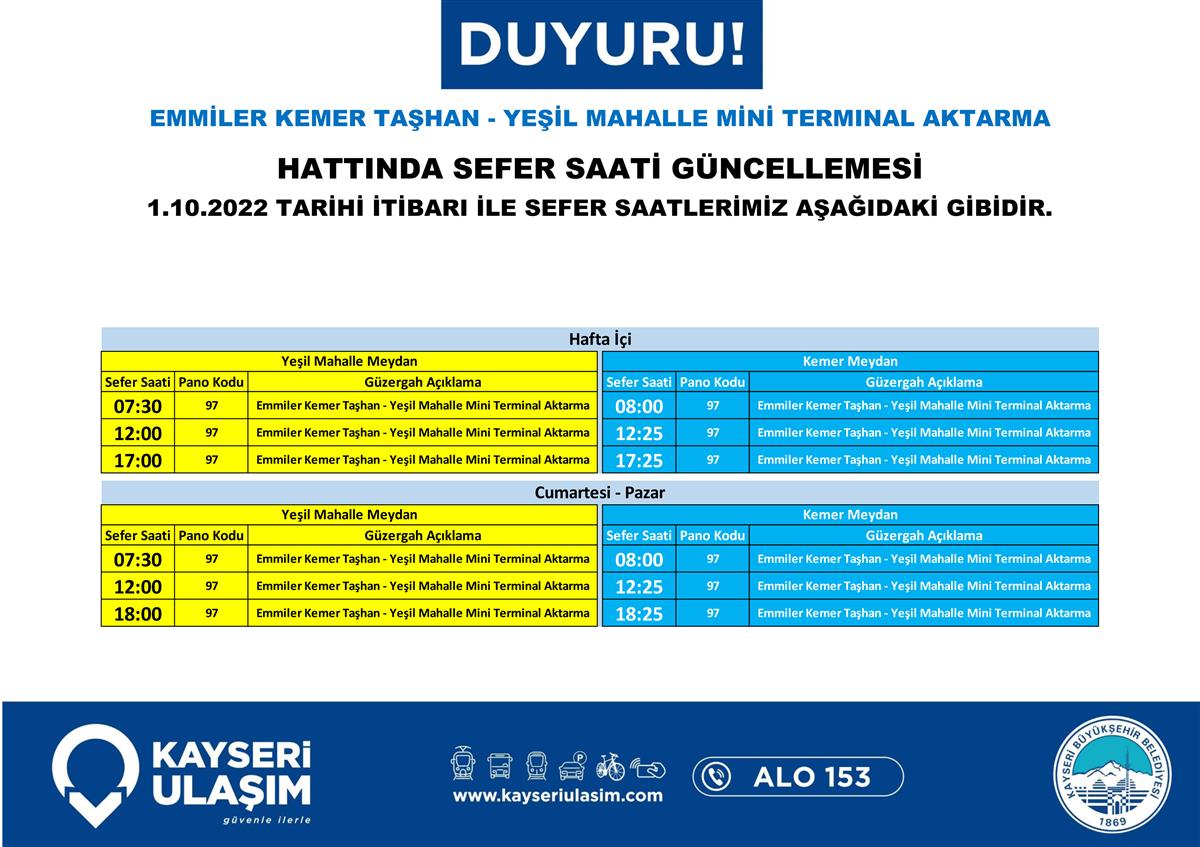 Sayın yolcularımız, aşağıdaki görsellerde yer alan hatlarda hat ve sefer saat güncellemeleri yapılmıştır. Güncel sefer saati, güzergah bilgilerine web sitemiz ve mobil uygulamamız üzerinden ulaşabilirsiniz. Sağlıklı yolculuklar dileriz.