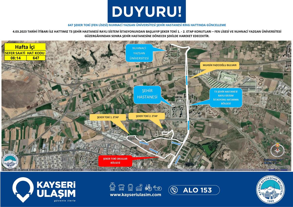 647 şeker toki (fen lisesi) nuhnaci yazgan üniversitesi şehir hastanesi ring hattında güncelleme 4.03.2023 tarihi itibarı ile hattımız t3 şehir hastanesi raylı sistem istasyonundan başlayıp şeker toki 1. - 2. etap konutları – fen lisesi ve nuhnaci yazgan üniversitesi güzergâhından sonra şehir hastanesine dönecek şekilde hareket edecektir