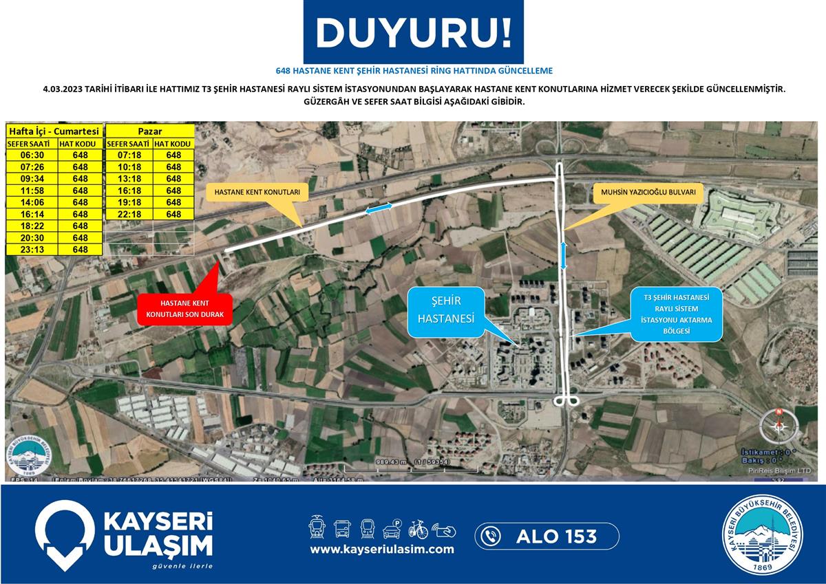 648 hastane kent şehir hastanesi ring hattında güncelleme 4.03.2023 tarihi itibarı ile hattımız t3 şehir hastanesi raylı sistem istasyonundan başlayarak hastane kent konutlarına hizmet verecek şekilde güncellenmiştir. güzergâh ve sefer saat bilgisi aşağıdaki tablodaki gibidir.
