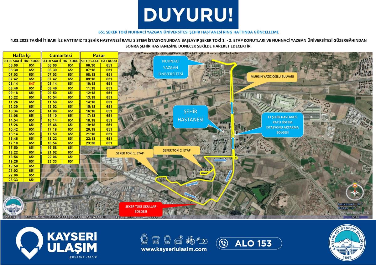 651 şeker toki nuhnaci yazgan üniversitesi şehir hastanesi ring hattında güncelleme 4.03.2023 tarihi itibarı ile hattımız T3 şehir hastanesi raylı sistem istasyonundan başlayıp şeker toki 1. - 2. etap konutları ve nuhnaci yazgan üniversitesi güzergâhından sonra şehir hastanesine dönecek şekilde hareket edecektir.