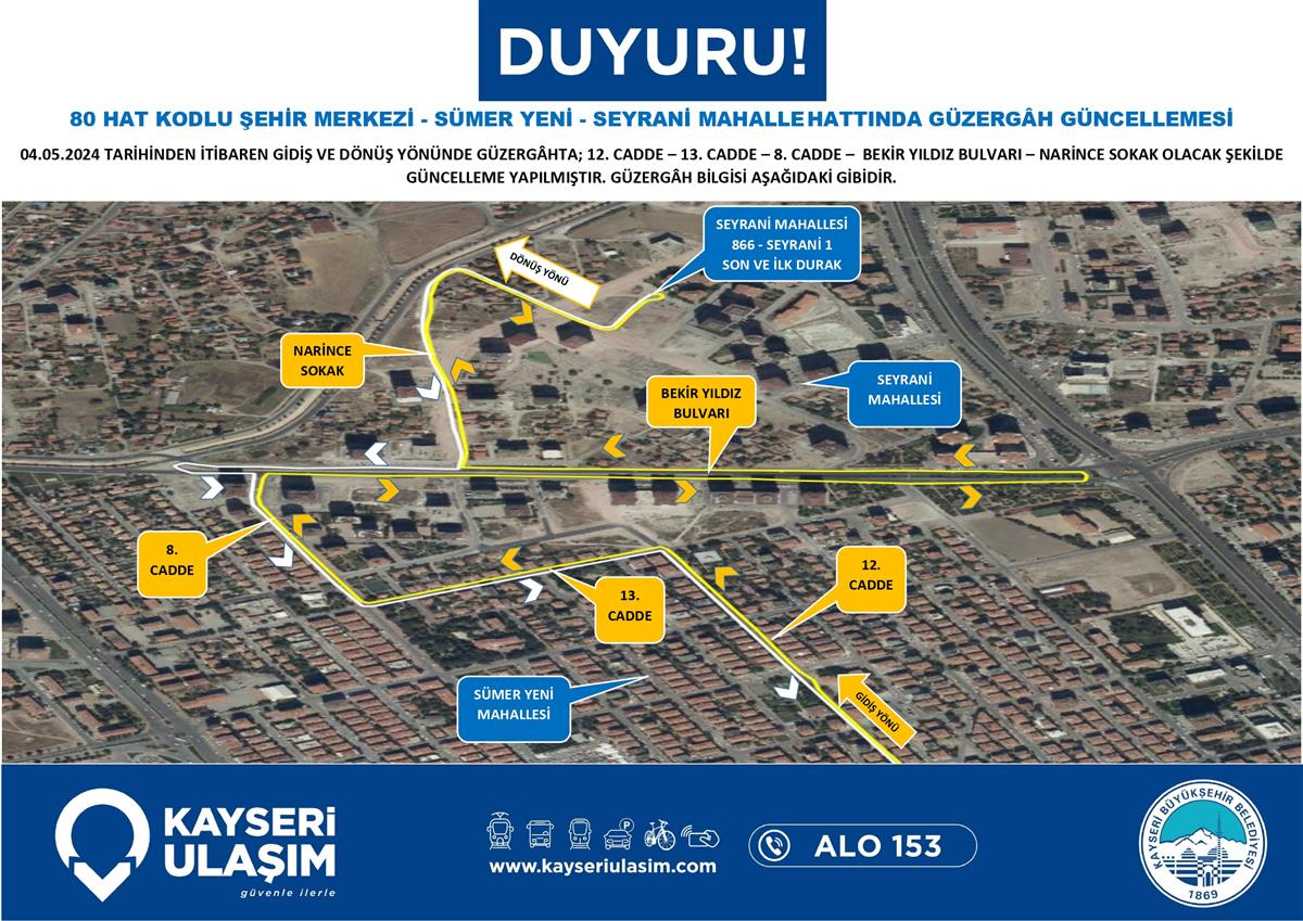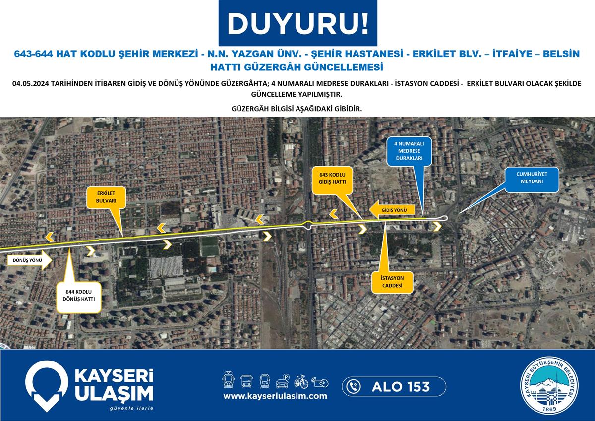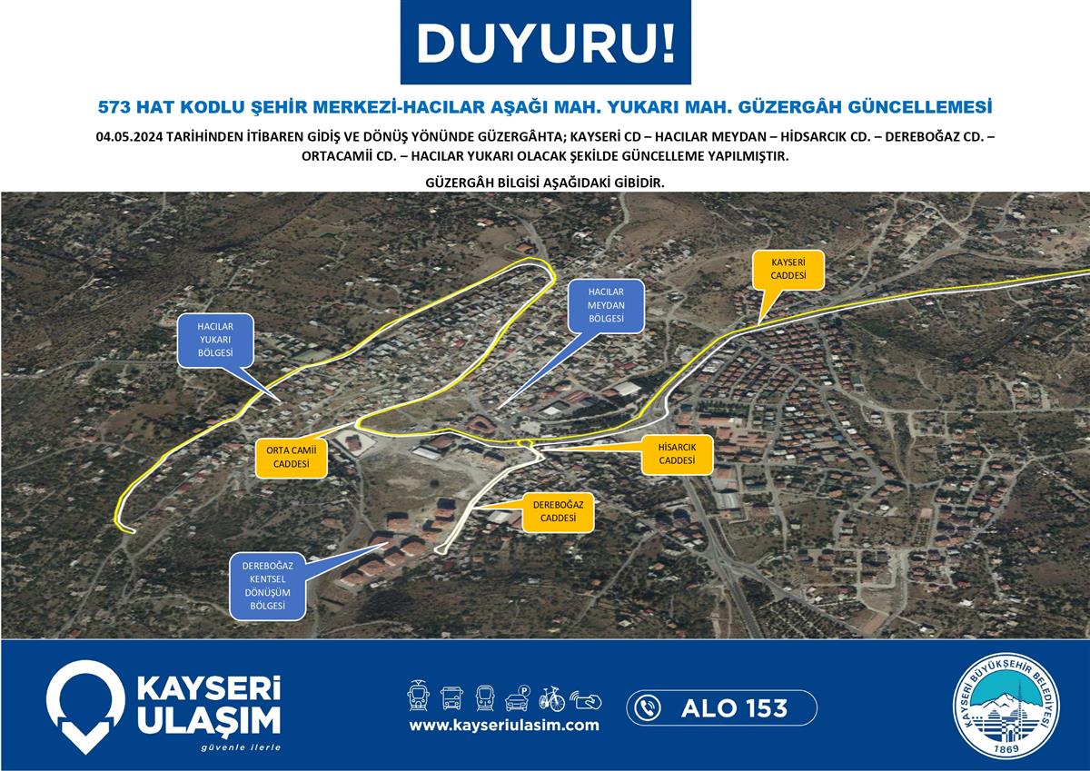 ŞEHİR MERKEZİ - SÜMER YENİ - SEYRANİ MAHALLE HATTINDA GÜZERGÂH GÜNCELLEMESİ ŞEHİR MERKEZİ-HACILAR AŞAĞI MAH. YUKARI MAH. GÜZERGÂH GÜNCELLEMESİ ŞEHİR MERKEZİ - N.N. YAZGAN ÜNV. - ŞEHİR HASTANESİ - ERKİLET BLV. – İTFAİYE – BELSİN HATTI GÜZERGÂH GÜNCELLEMESİ BAŞAKPINAR KURUKÖPRÜ ÇATAKDERE TALAS BELEDİYESİ RSİ AKTARMA HACILAR AKDAM HACILAR AKDAM ULUYER HASTANE KENT ŞEHİR HASTANESİ AKTARMA RİNG 04-06 Mayıs 2024 Tarihinden itibaren Bazı Sefer Saat ve Güzergah Güncellemeleri Yapılmıştır.