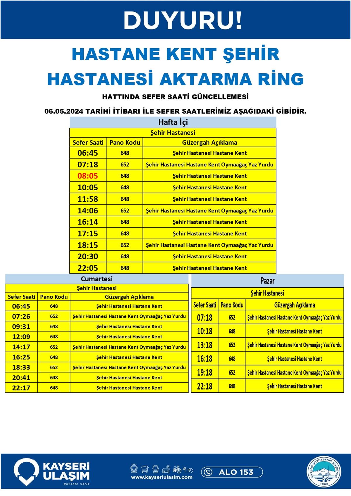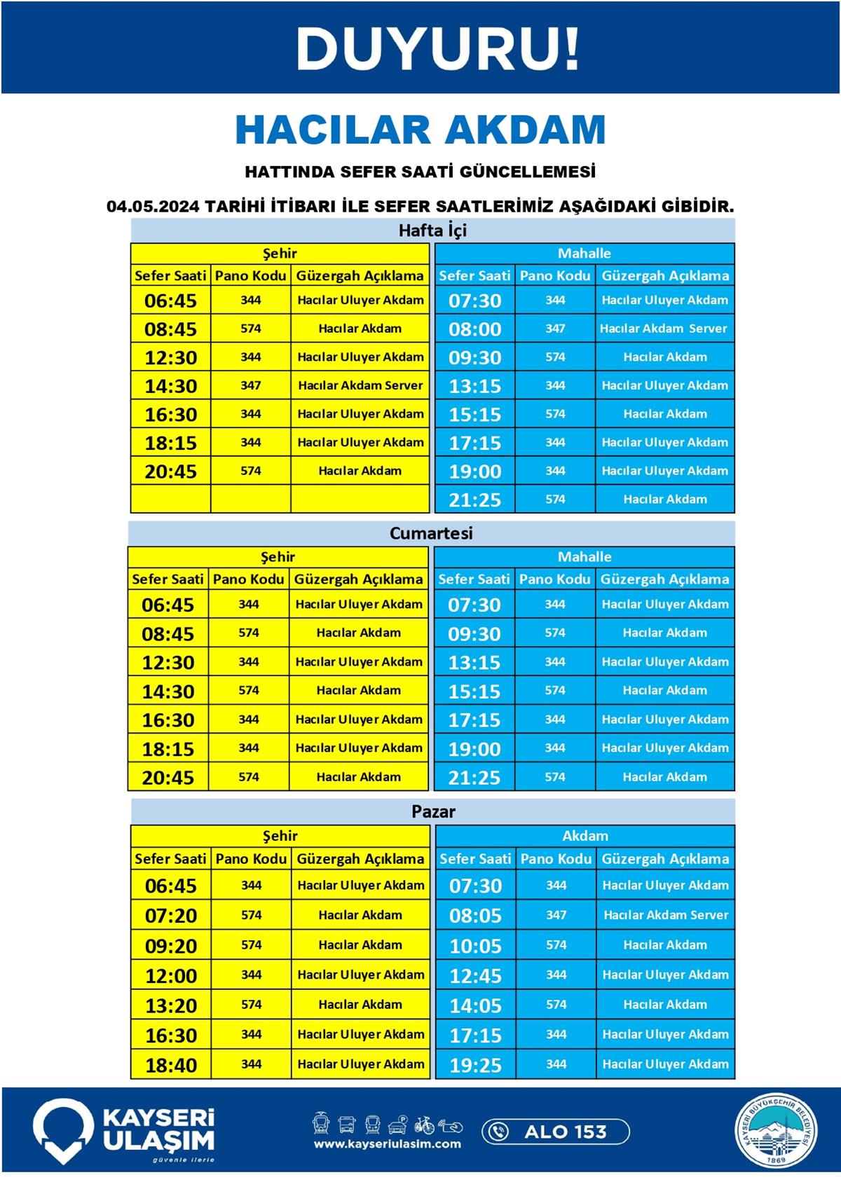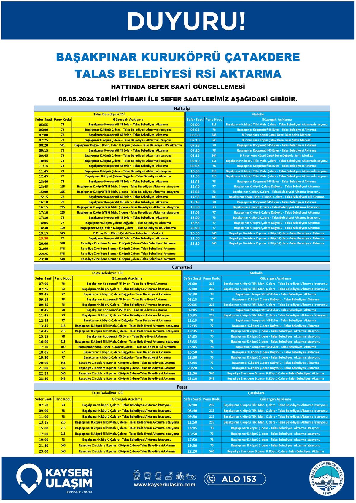 ŞEHİR MERKEZİ - SÜMER YENİ - SEYRANİ MAHALLE HATTINDA GÜZERGÂH GÜNCELLEMESİ ŞEHİR MERKEZİ-HACILAR AŞAĞI MAH. YUKARI MAH. GÜZERGÂH GÜNCELLEMESİ ŞEHİR MERKEZİ - N.N. YAZGAN ÜNV. - ŞEHİR HASTANESİ - ERKİLET BLV. – İTFAİYE – BELSİN HATTI GÜZERGÂH GÜNCELLEMESİ BAŞAKPINAR KURUKÖPRÜ ÇATAKDERE TALAS BELEDİYESİ RSİ AKTARMA HACILAR AKDAM HACILAR AKDAM ULUYER HASTANE KENT ŞEHİR HASTANESİ AKTARMA RİNG 04-06 Mayıs 2024 Tarihinden itibaren Bazı Sefer Saat ve Güzergah Güncellemeleri Yapılmıştır.