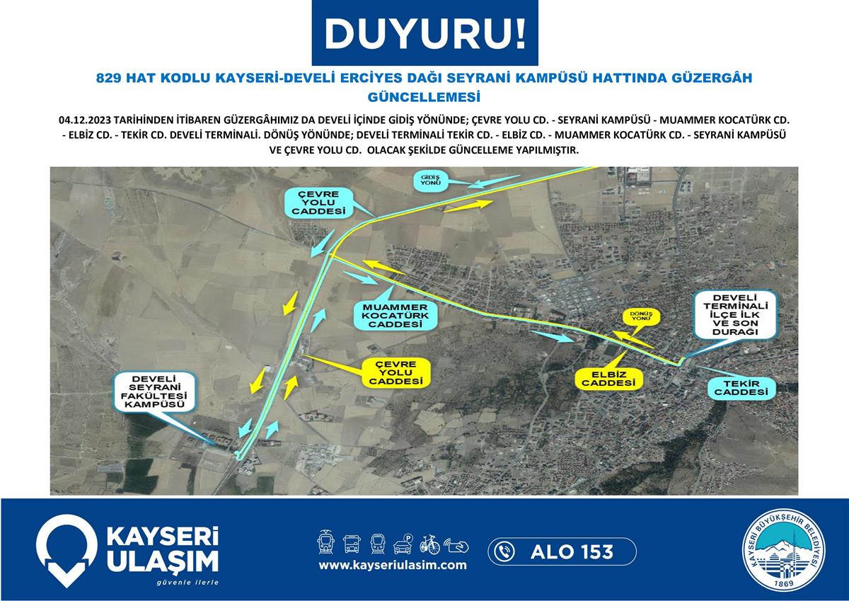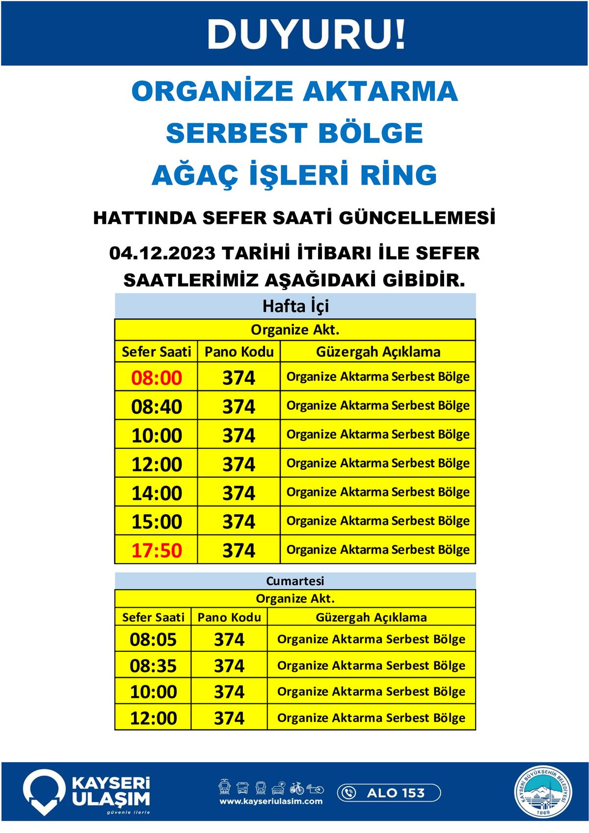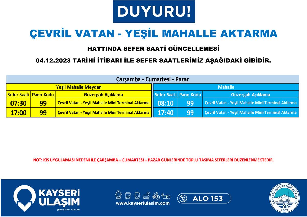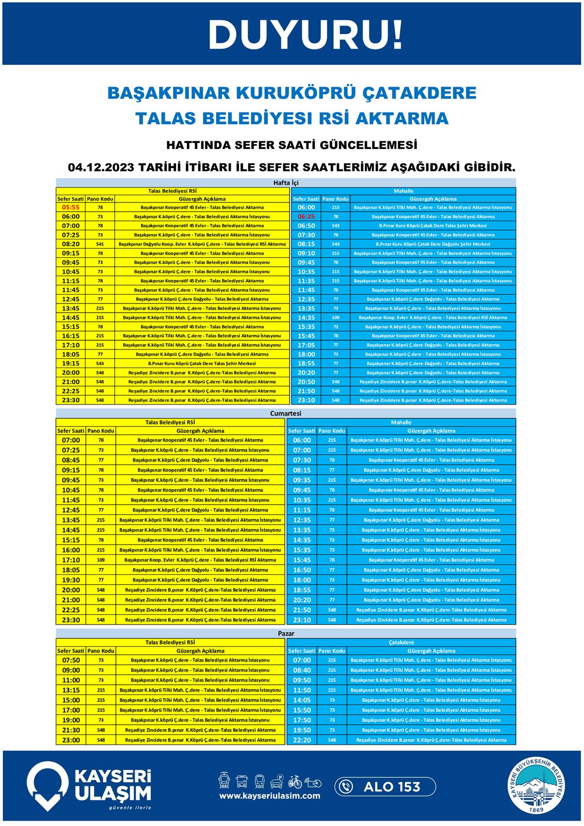 04 Aralık 2023 Tarihinden İtibaren Bazı Sefer Saat ve Güzergah Güncellemeleri Yapılmıştır.