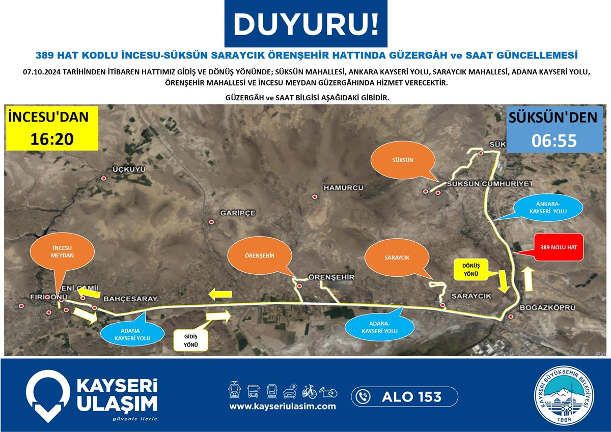 İNCESU-SÜKSÜN SARAYCIK ÖRENŞEHİR HATTINDA GÜZERGÂH ve SAAT GÜNCELLEMESİ