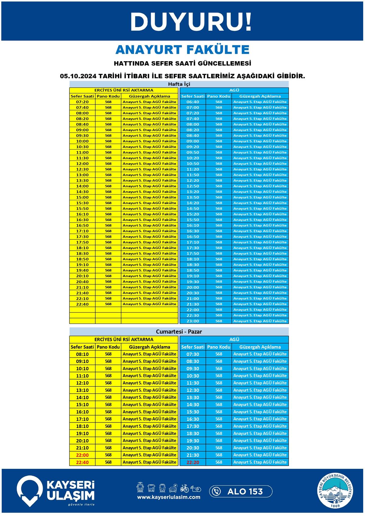 ANAYURT FAKÜLTE HATTINDA SEFER SAATİ GÜNCELLEMESİ