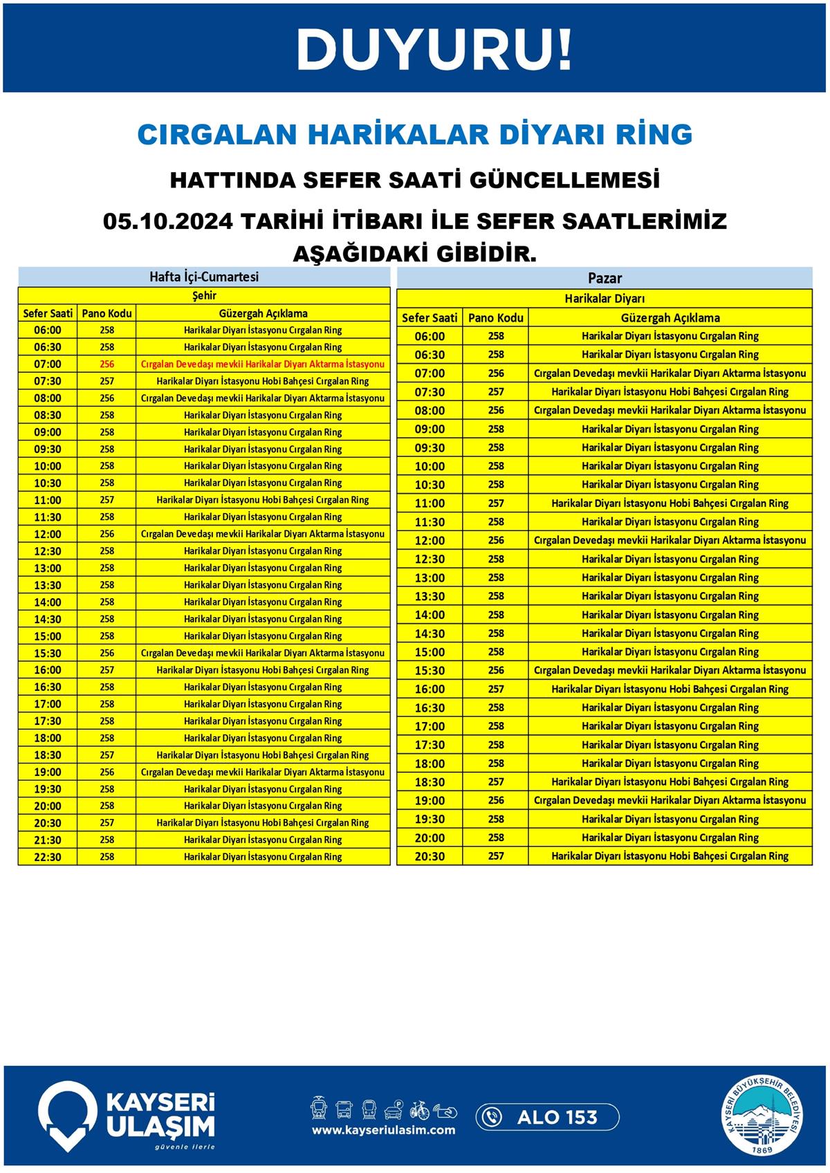 CIRGALAN HARİKALAR DİYARI RİNG HATTINDA SEFER SAATİ GÜNCELLEMESİ