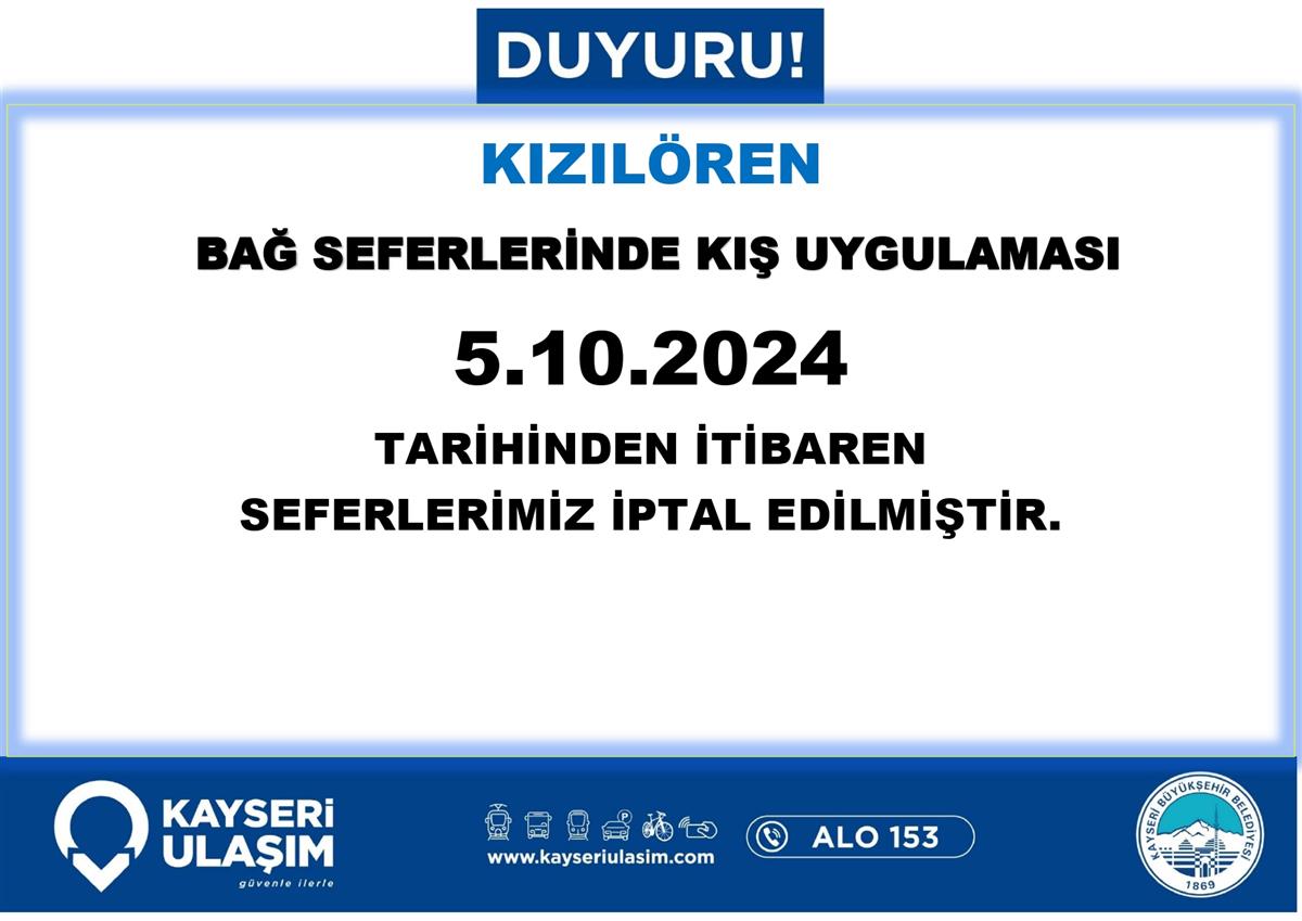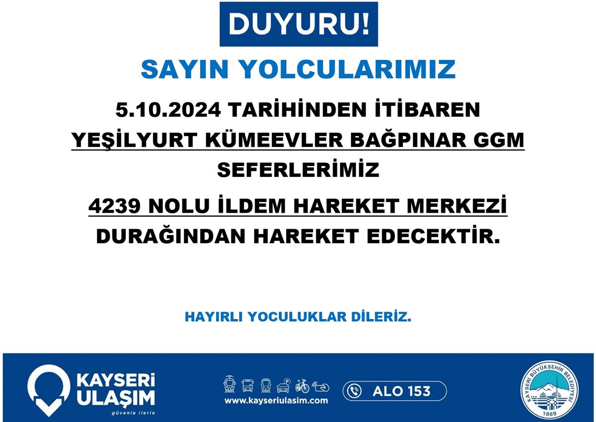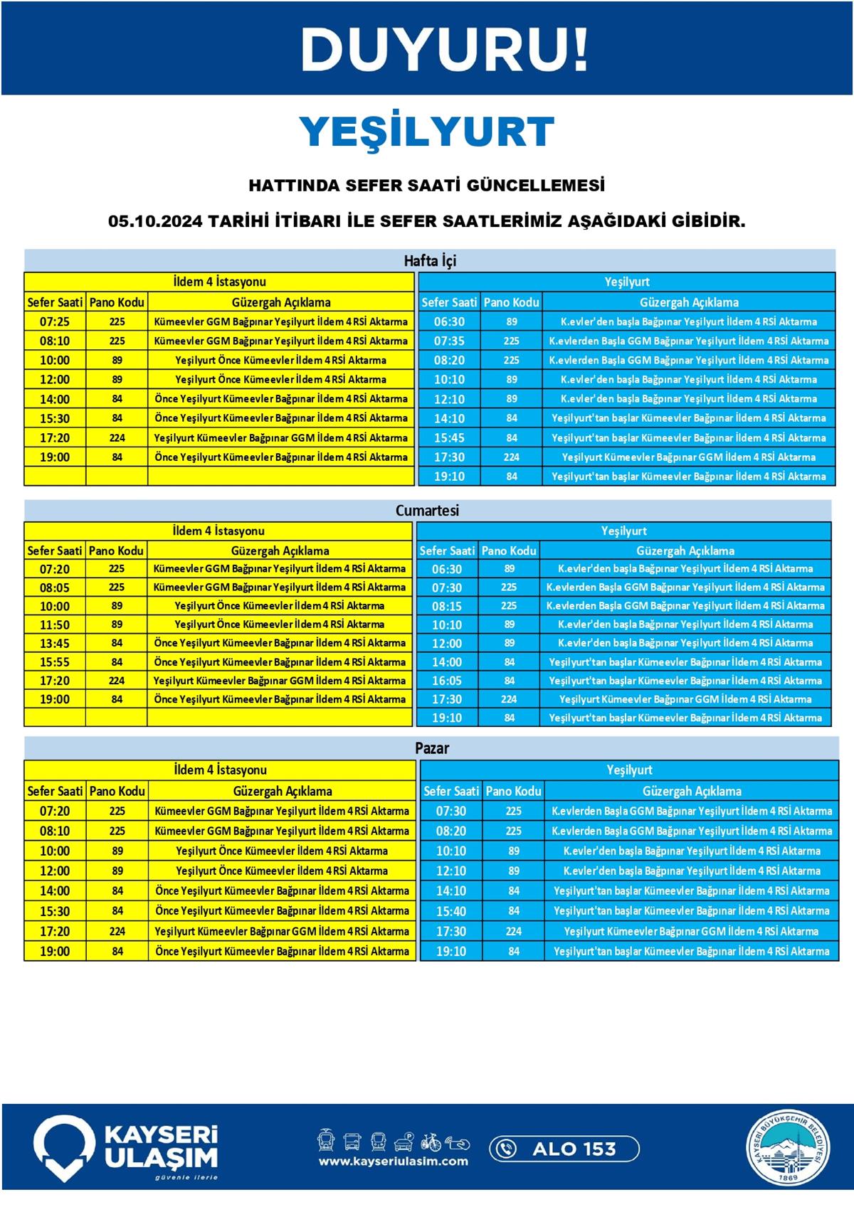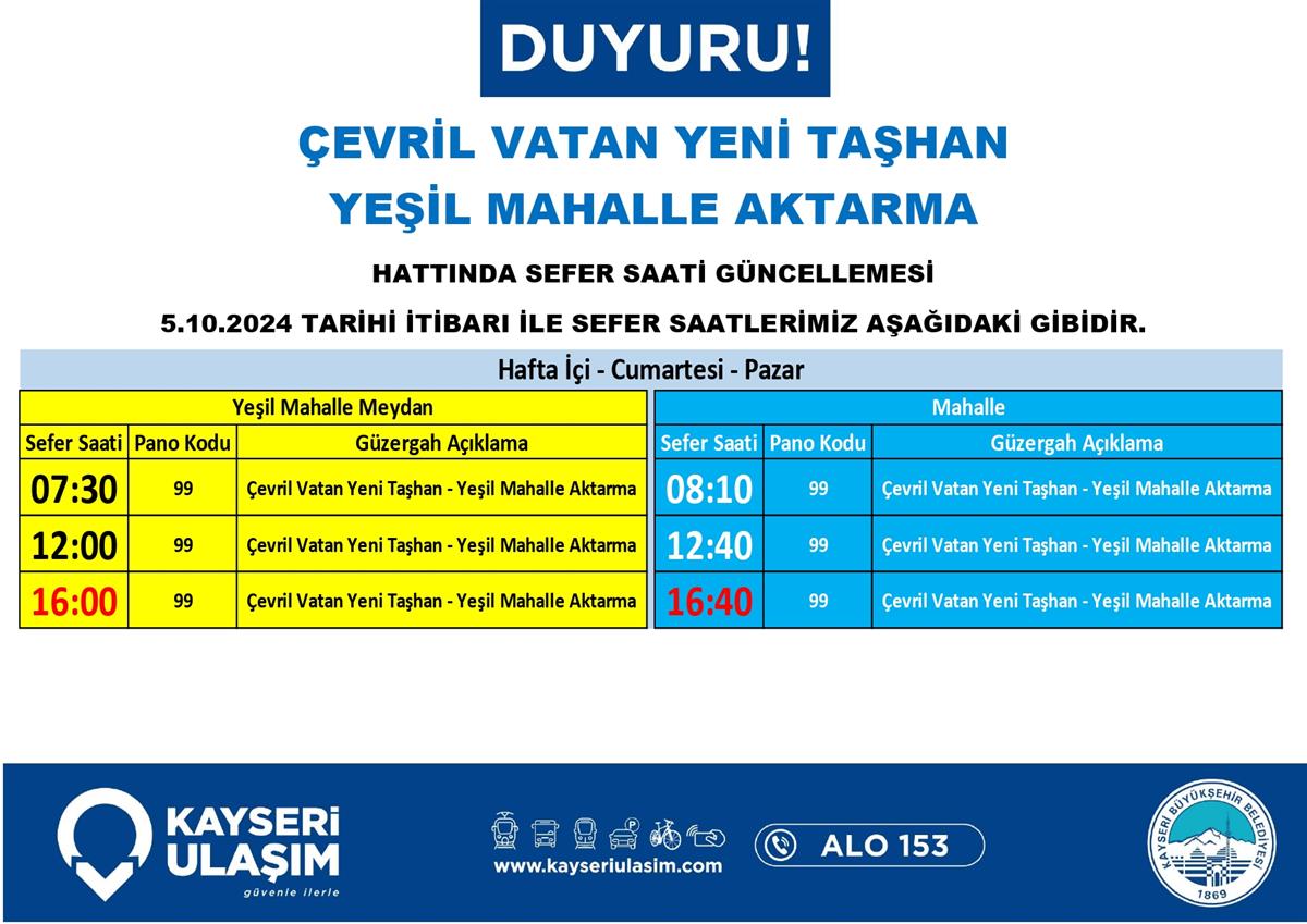 05 Ekim 2024 Tarihinden itibaren Bazı Sefer Saat ve Güzergah Güncellemeleri Yapılmıştır.