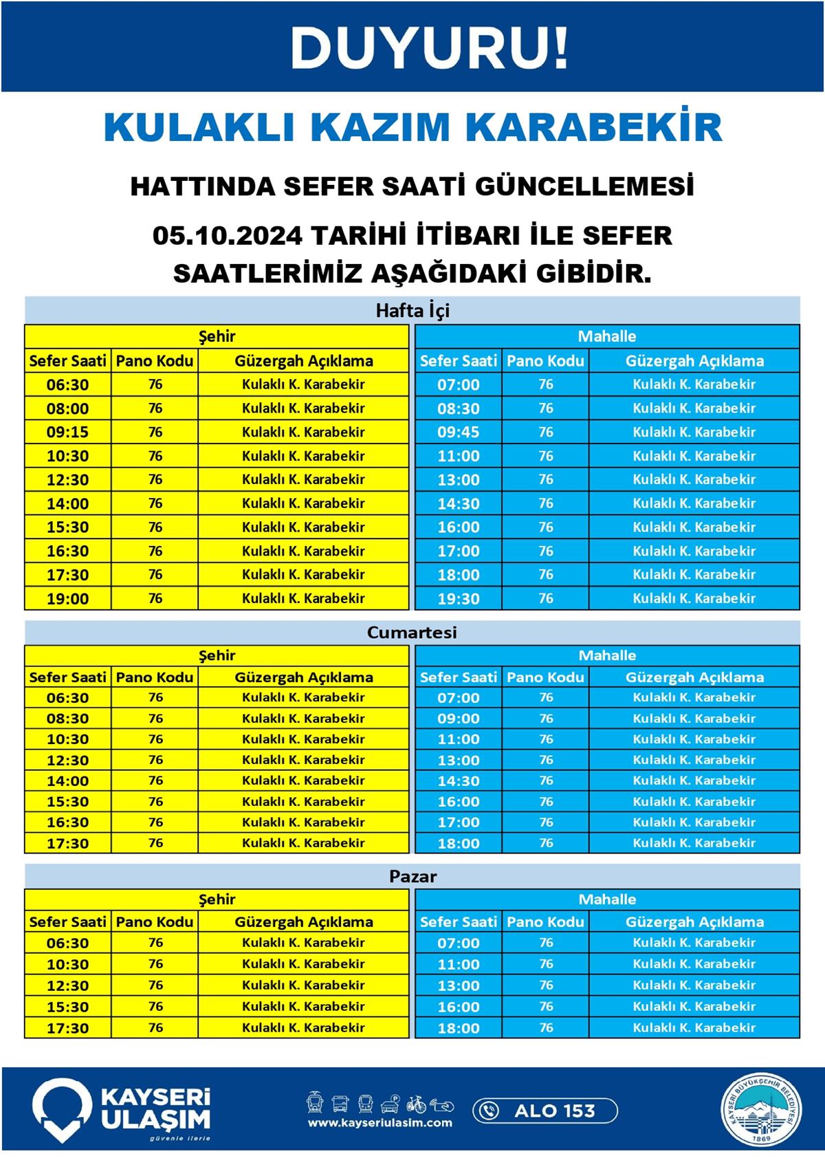 KULAKLI KAZIM KARABEKİR HATTINDA SEFER SAATİ GÜNCELLEMESİ