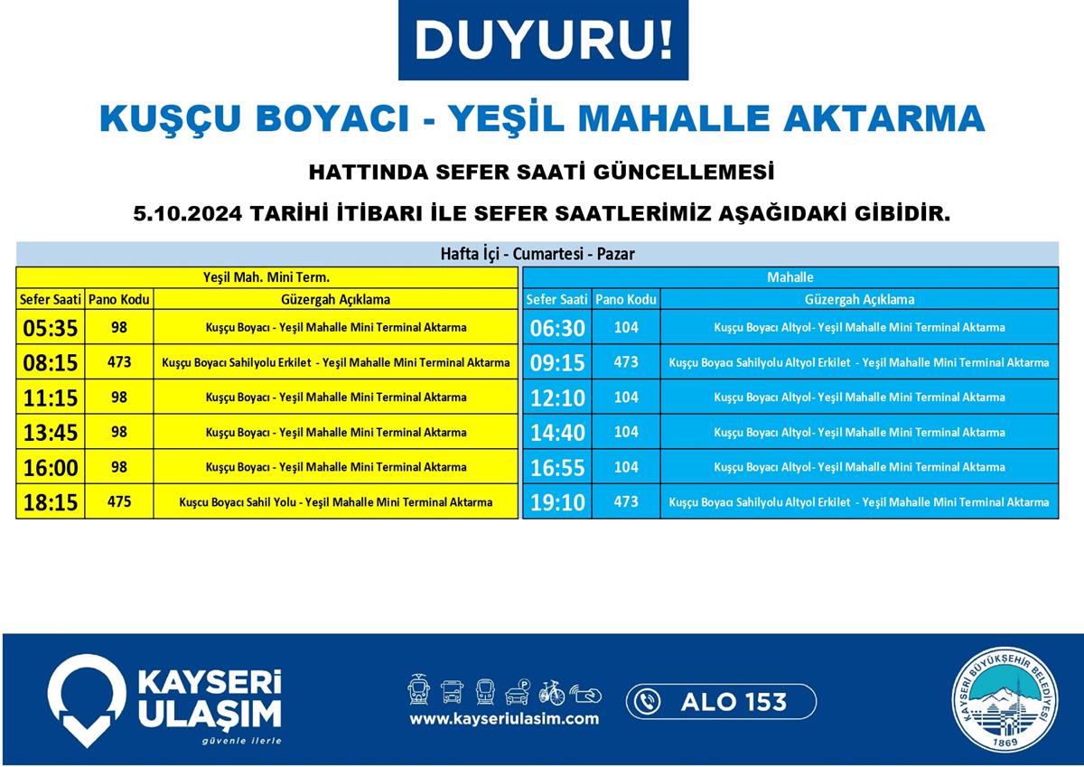 KUŞÇU BOYACI - YEŞİL MAHALLE AKTARMA HATTINDA SEFER SAATİ GÜNCELLEMESİ