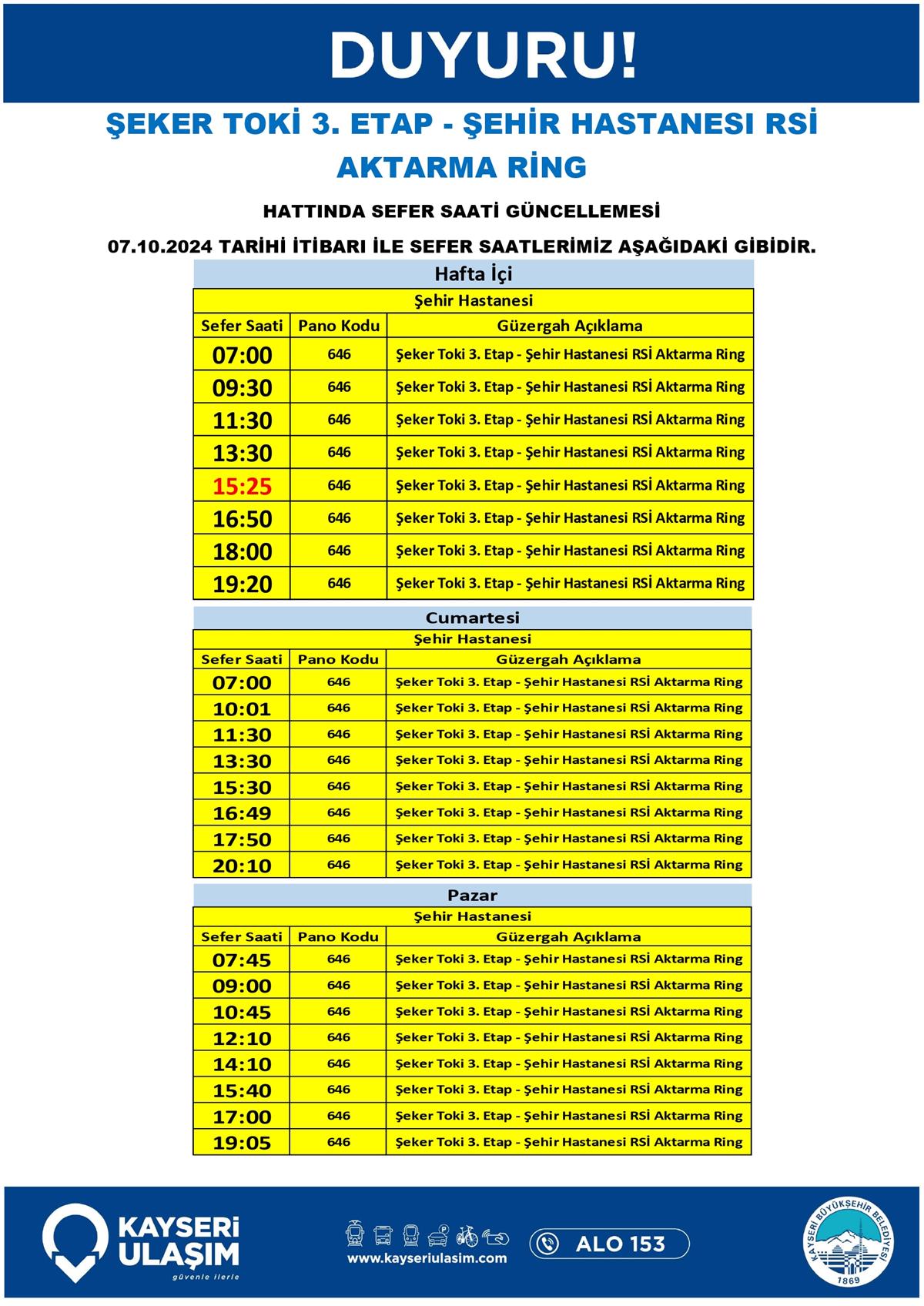 ŞEKER TOKİ 3. ETAP - ŞEHİR HASTANESI RSİ AKTARMA RİNG HATTINDA SEFER SAATİ GÜNCELLEMESİ