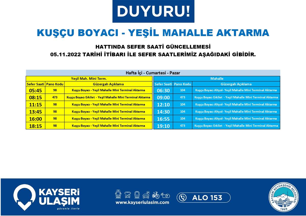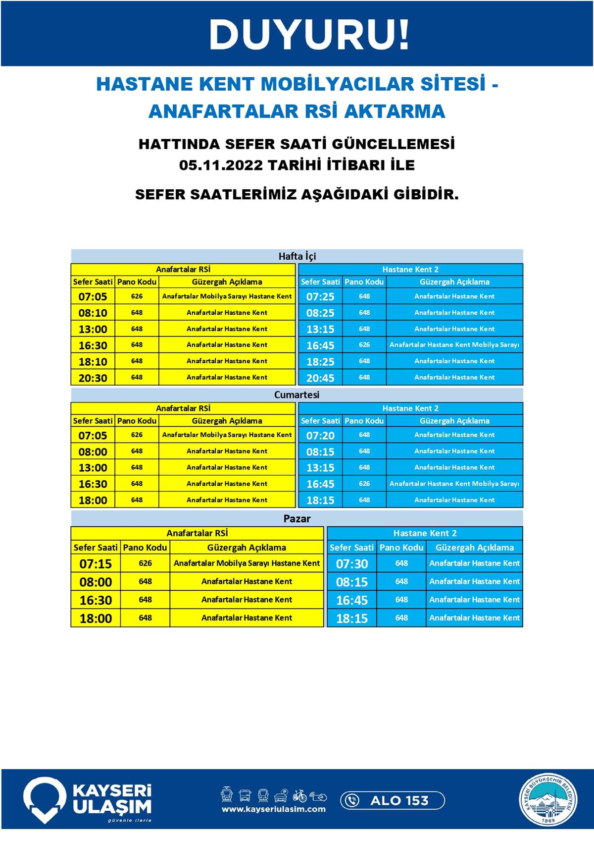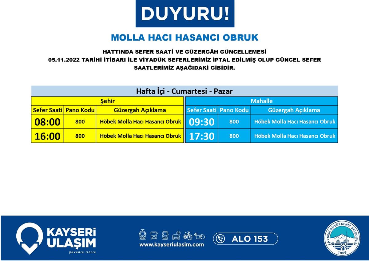 Sayın yolcularımız, aşağıdaki görsellerde yer alan hatlarda hat ve sefer saat güncellemeleri yapılmıştır. Güncel sefer saati, güzergah bilgileri aşağıda sunulmuştur. İyi yolculuklar dileriz...