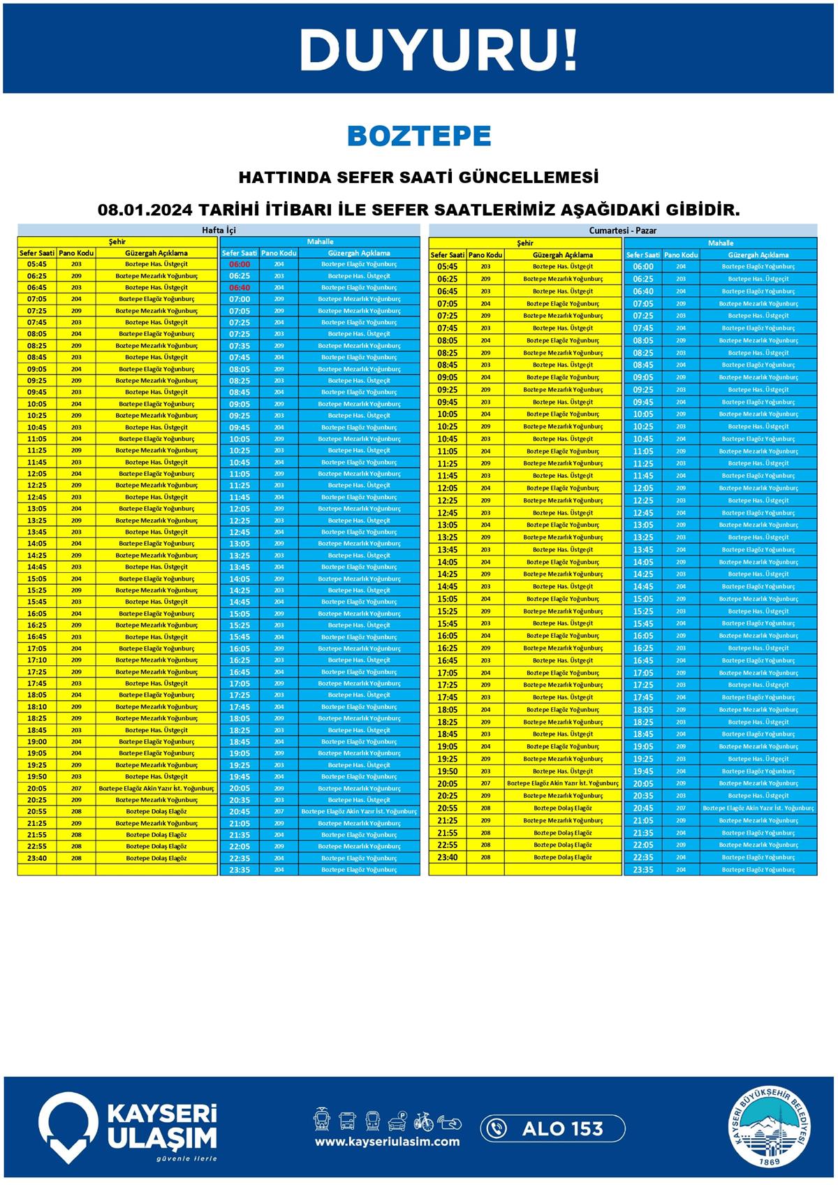 BOZTEPE HATTINDA SEFER SAATİ GÜNCELLEMESİ