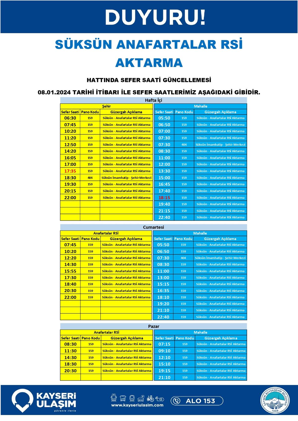 06-08 Ocak 2024 Tarihinden itibaren Bazı Sefer Saat ve Güzergah Güncellemeleri Yapılmıştır.