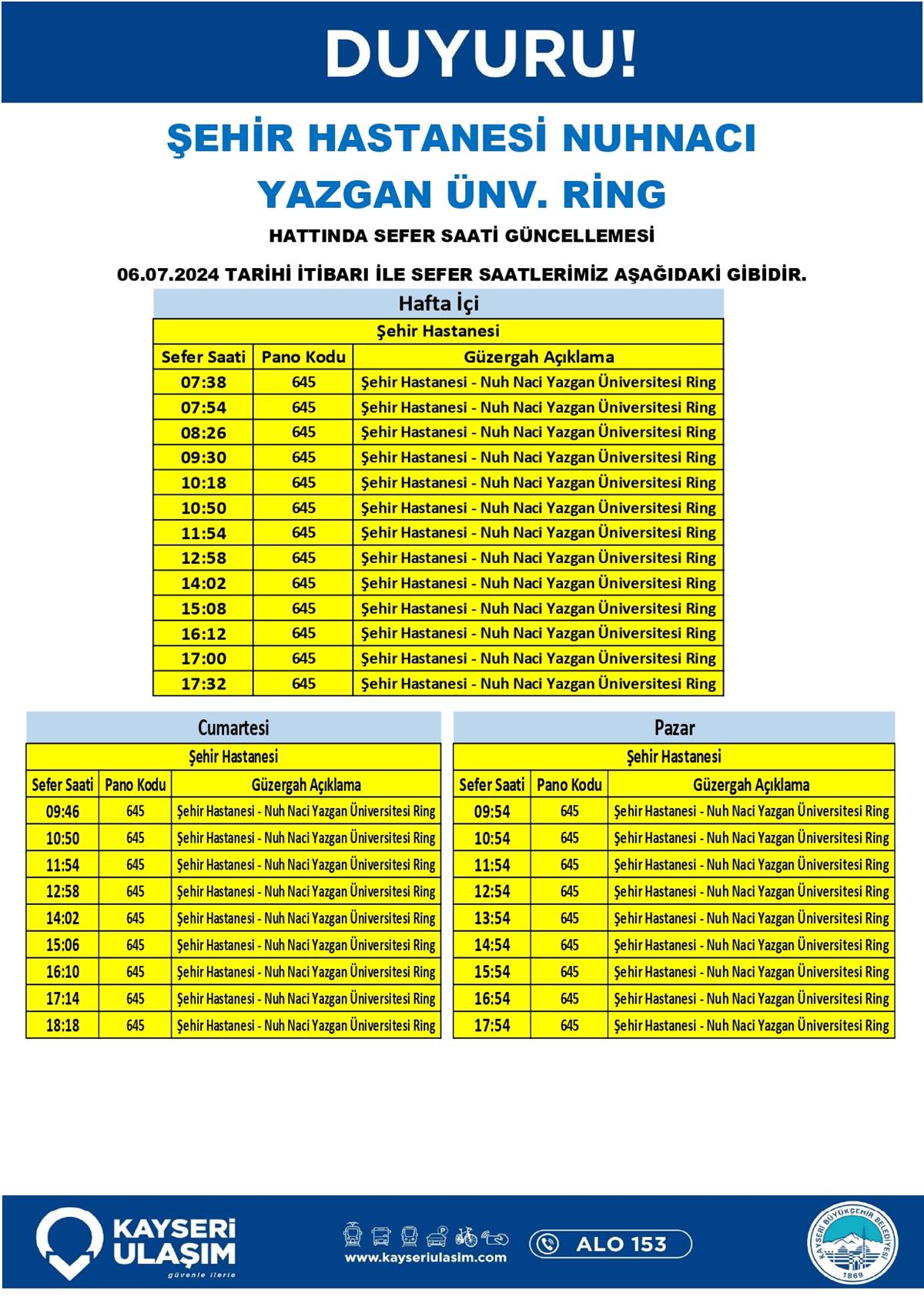 ŞEHİR HASTANESİ NUHNACI YAZGAN ÜNV. RİNG HATTINDA SEFER SAATİ GÜNCELLEMESİ