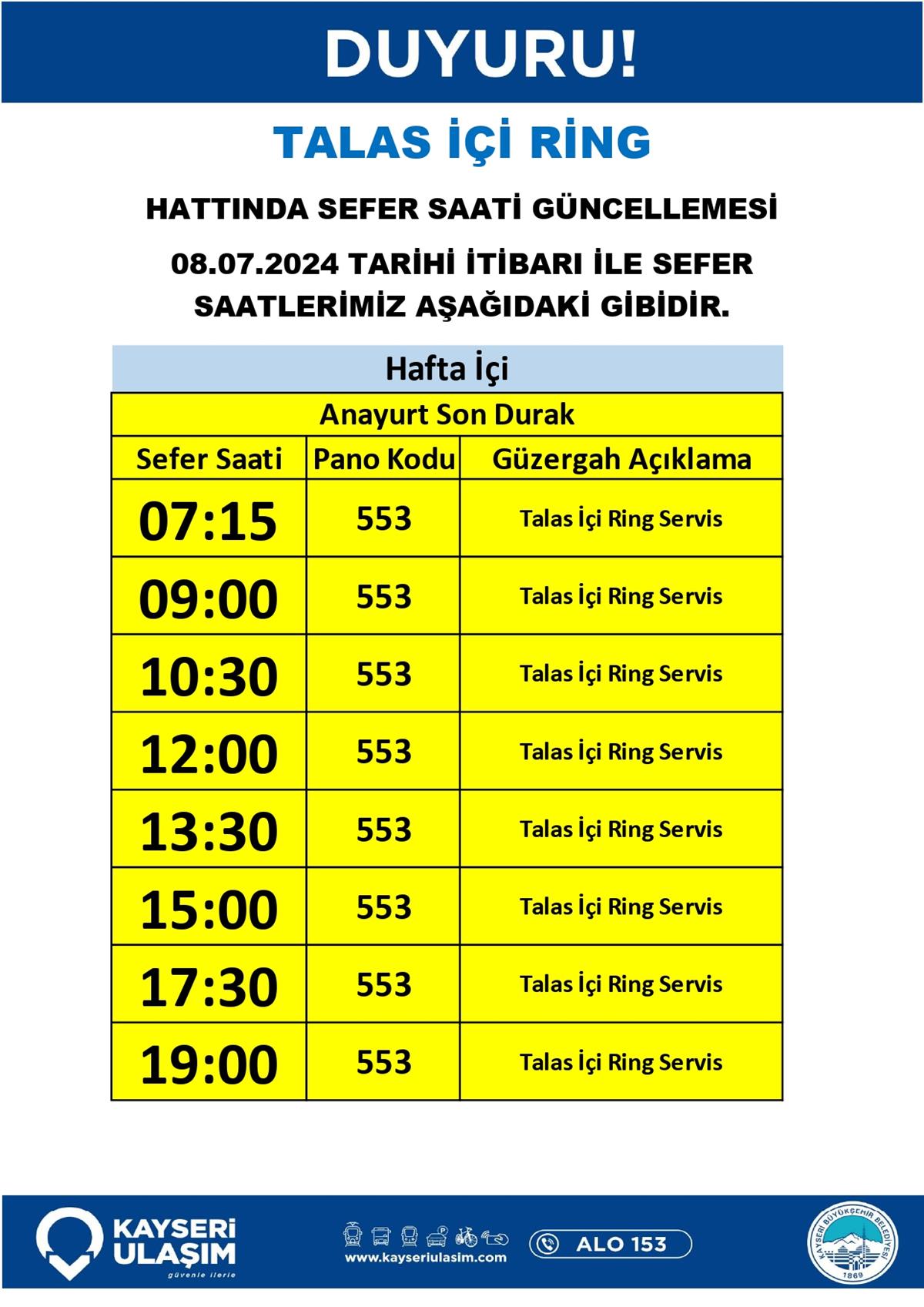 TALAS İÇİ RİNG HATTINDA SEFER SAATİ GÜNCELLEMESİ