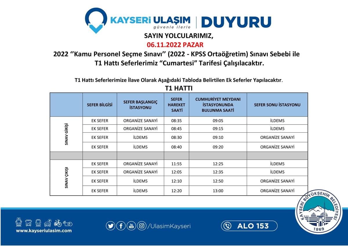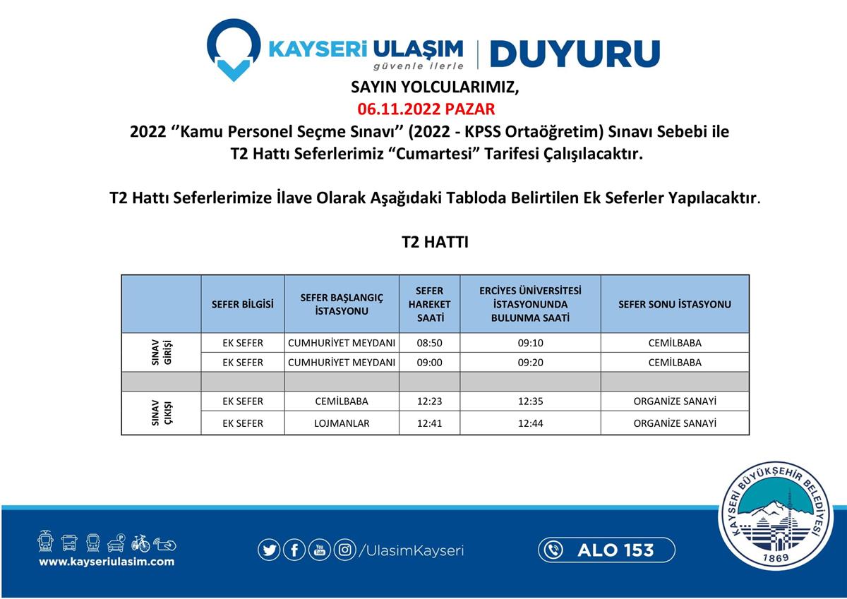 Sayın Yolcularımız; 06.11.2022 Pazar Günü uygulanacak tarife ve ek sefer bilgilerine duyurulardan erişebilirsiniz. KPSS'de Tüm Adaylara Başarılar Dileriz.