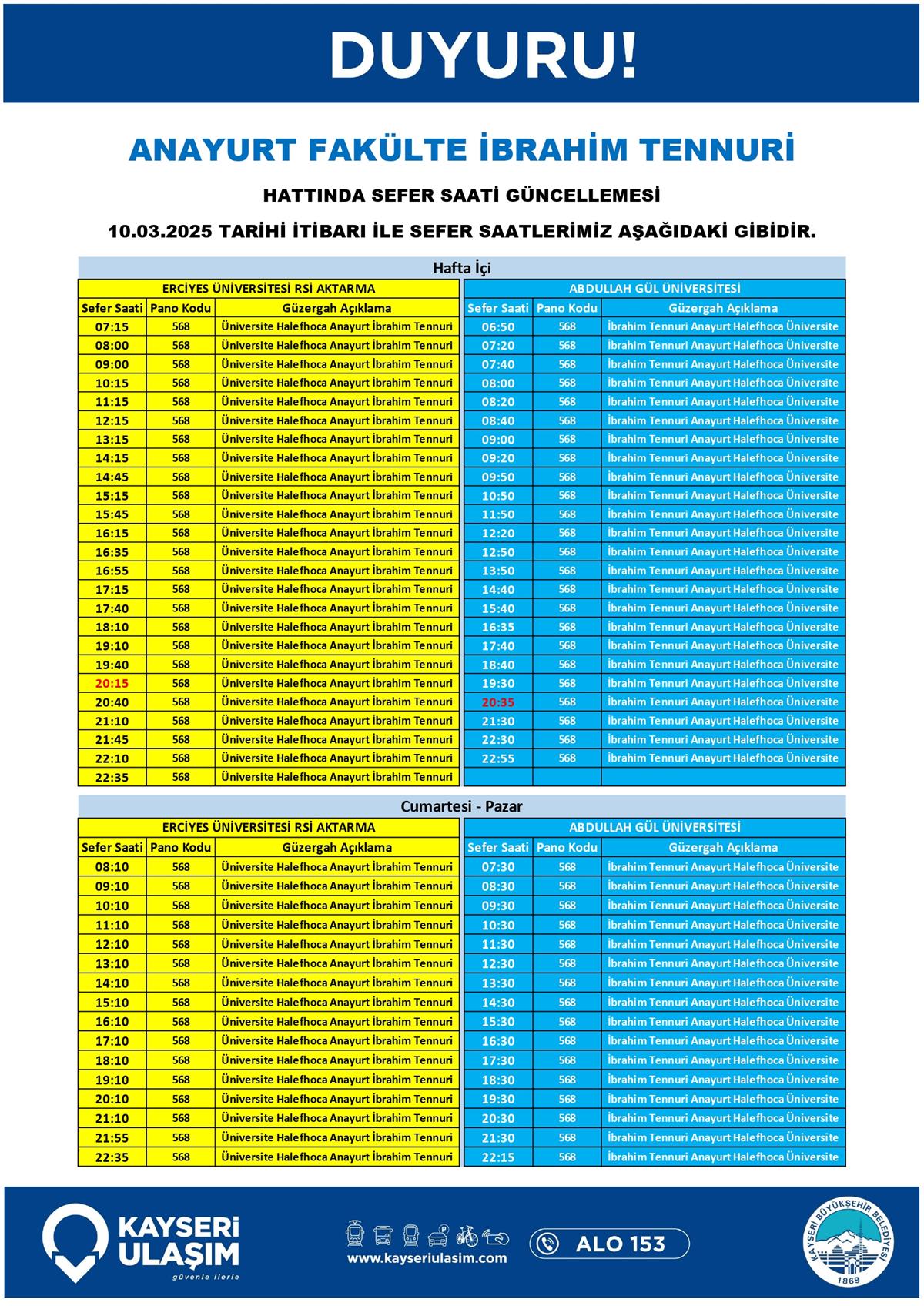 ANAYURT FAKÜLTE İBRAHİM TENNURİ HATTINDA SEFER SAATİ GÜNCELLEMESİ