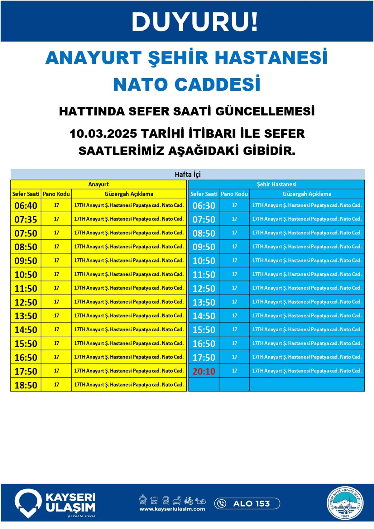 ANAYURT ŞEHİR HASTANESİ NATO CADDESİ HATTINDA SEFER SAATİ GÜNCELLEMESİ