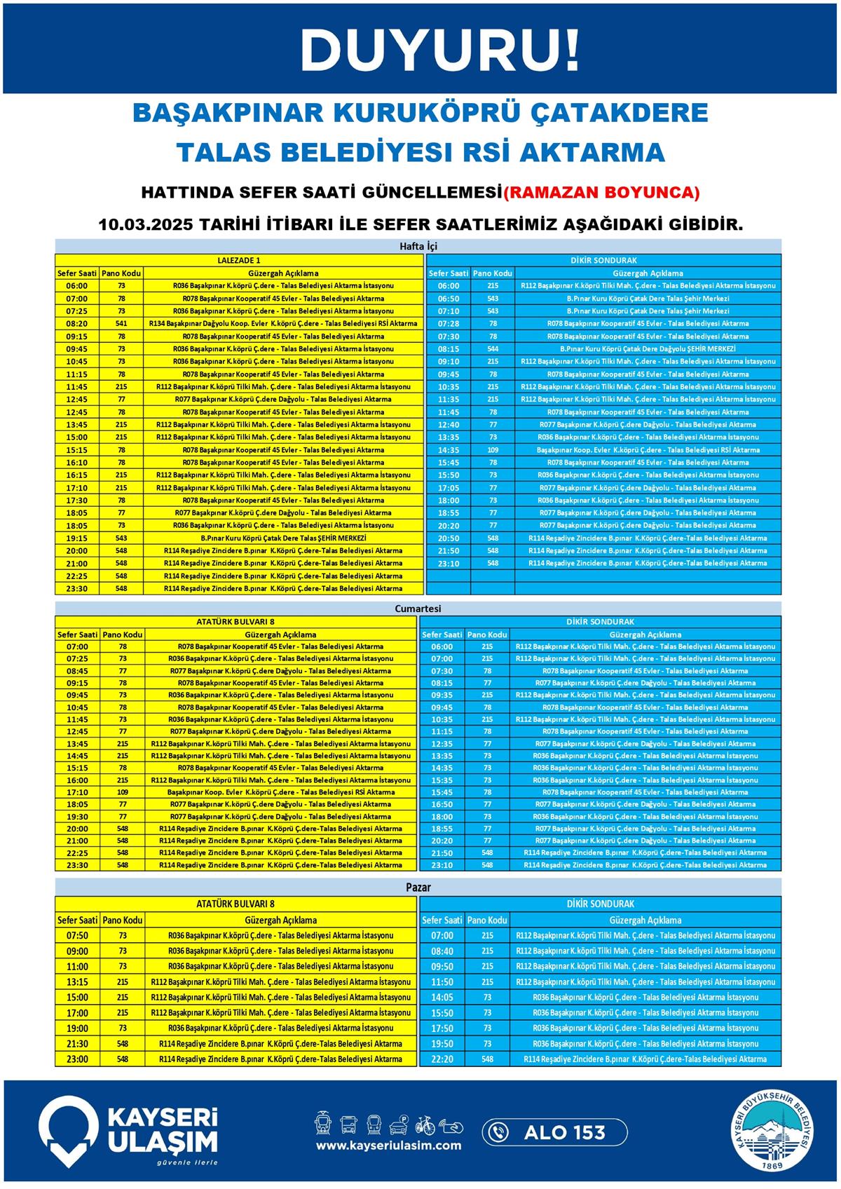 BAŞAKPINAR KURUKÖPRÜ ÇATAKDERE TALAS BELEDİYESI RSİ AKTARMA HATTINDA SEFER SAATİ GÜNCELLEMESİ