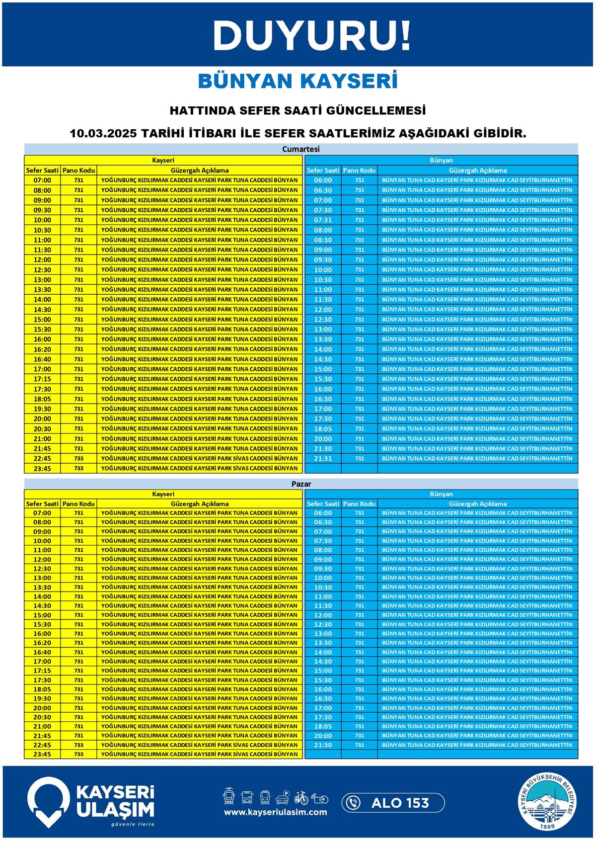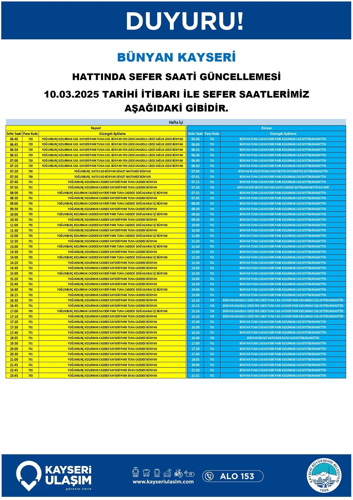 BÜNYAN KAYSERİ HATTINDA SEFER SAATİ GÜNCELLEMESİ
