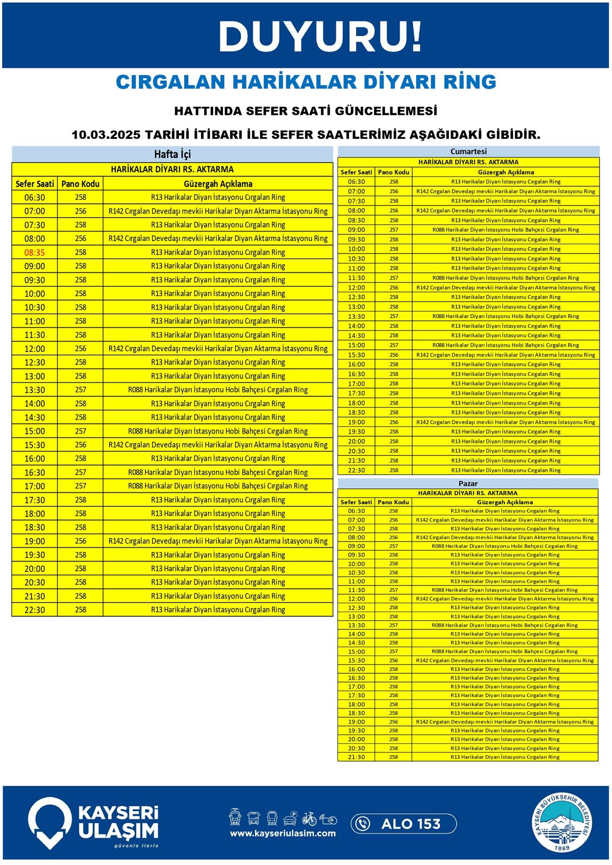 08 Mart 2025 Tarihinden itibaren Bazı Sefer Saat ve Güzergah Güncellemeleri Yapılmıştır.