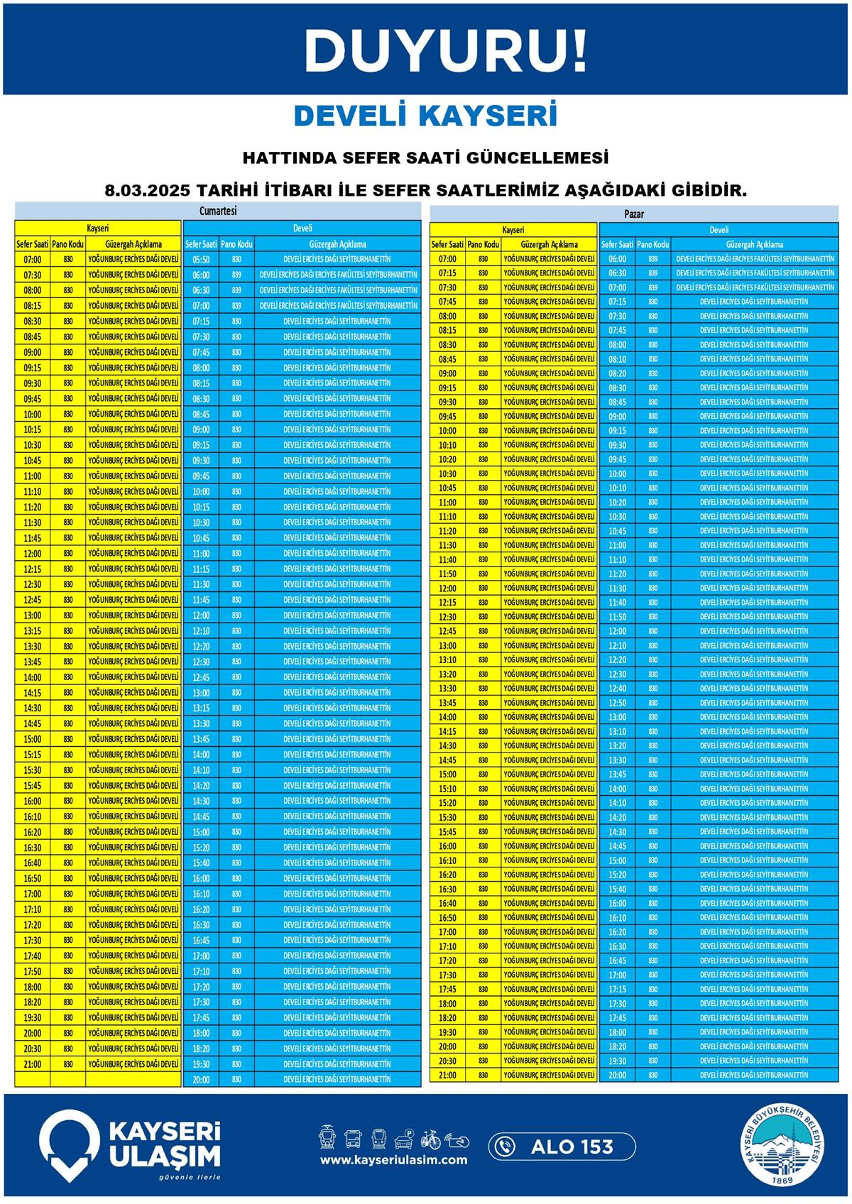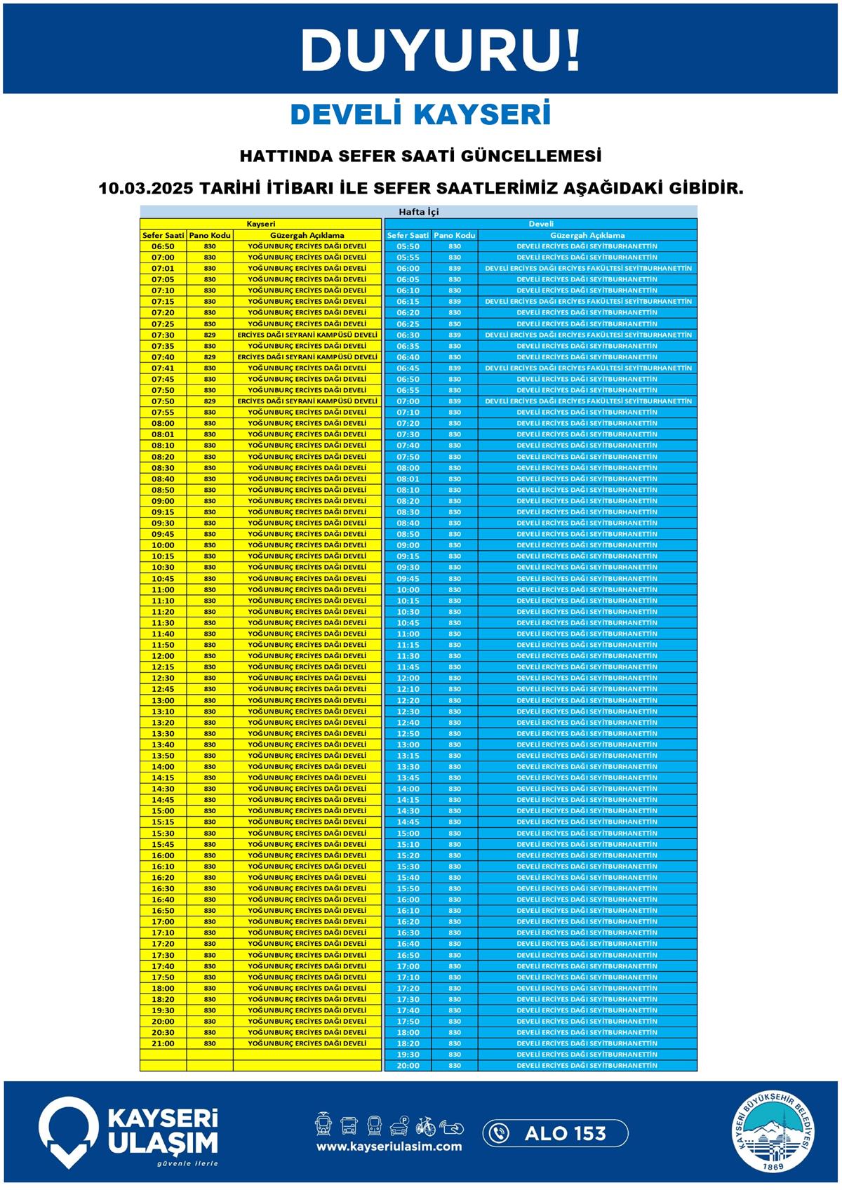 DEVELİ KAYSERİ HATTINDA SEFER SAATİ GÜNCELLEMESİ