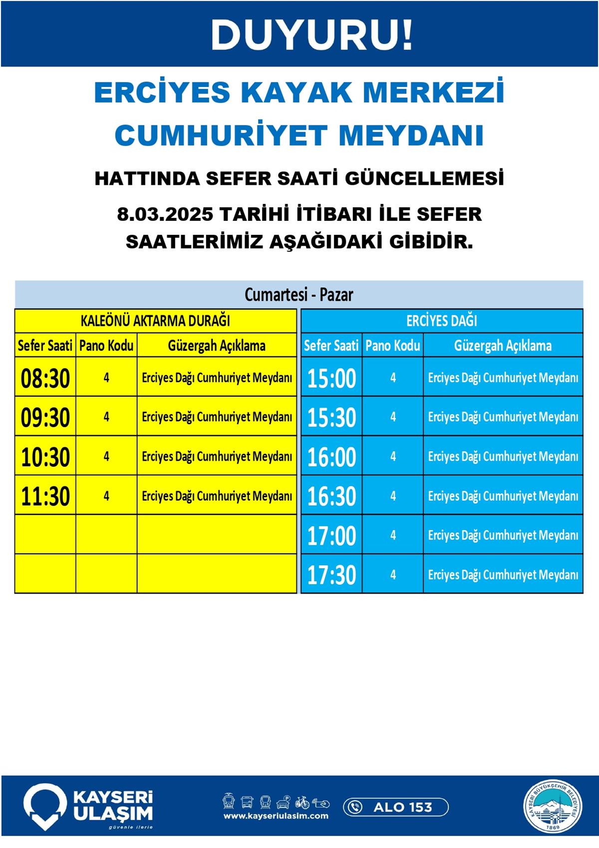 ERCİYES KAYAK MERKEZİ CUMHURİYET MEYDANI HATTINDA SEFER SAATİ GÜNCELLEMESİ
