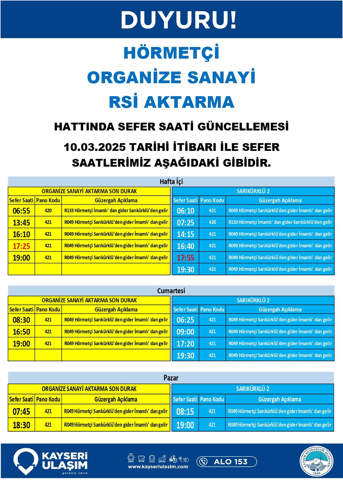 HÖRMETÇİ ORGANİZE SANAYİ RSİ AKTARMA HATTINDA SEFER SAATİ GÜNCELLEMESİ