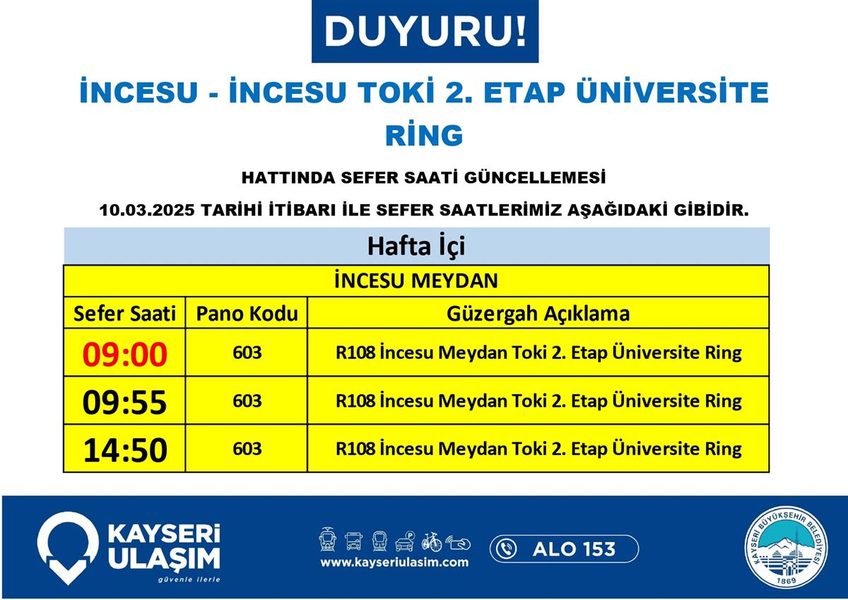 İNCESU - İNCESU TOKİ 2. ETAP ÜNİVERSİTE RİNG HATTINDA SEFER SAATİ GÜNCELLEMESİ